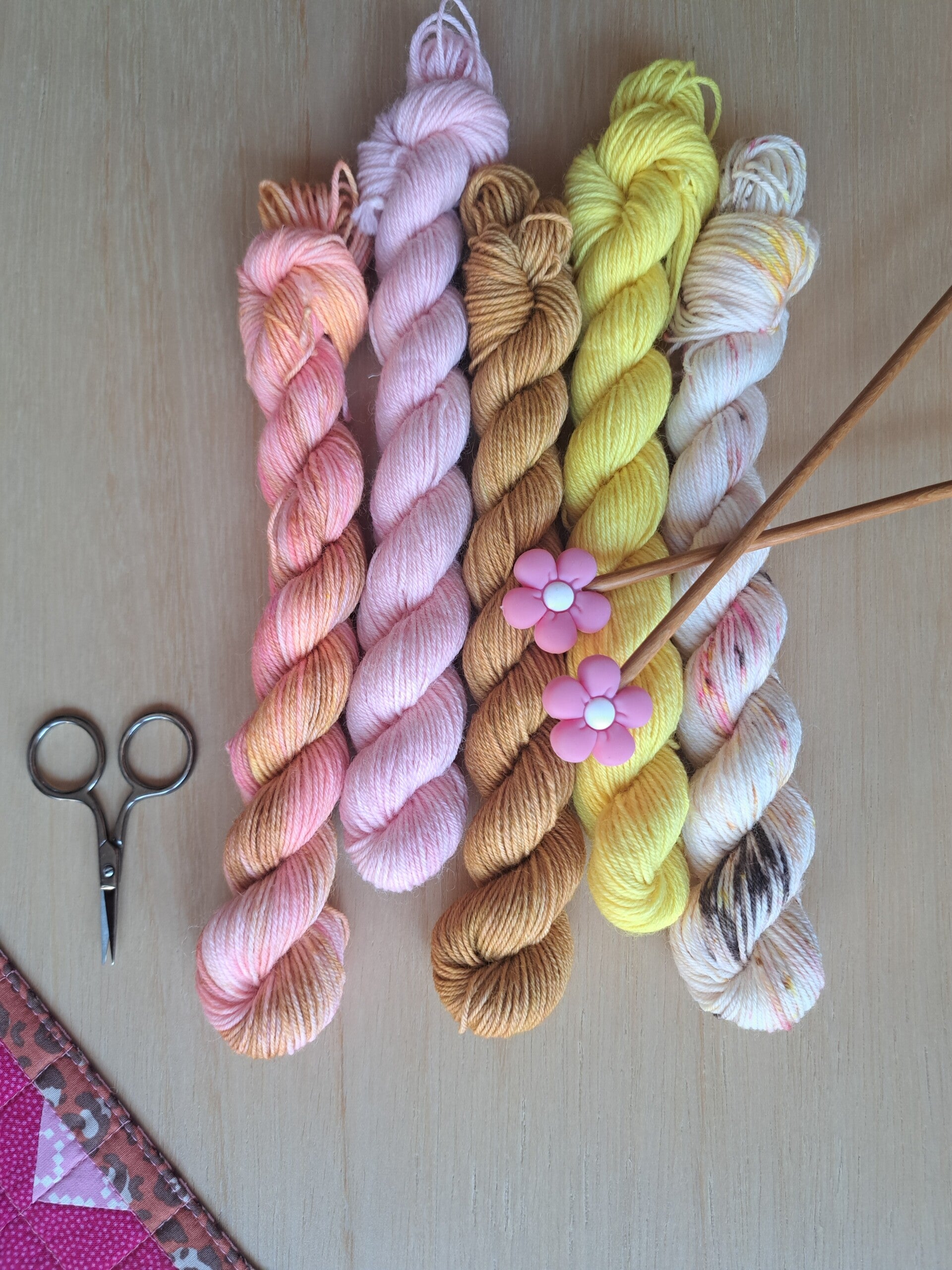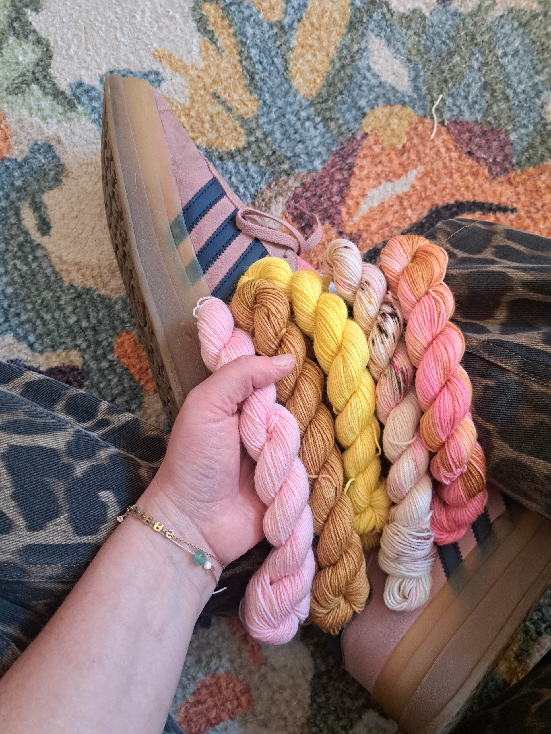 De kleuren lopen van zonnig geel naar warm honingbruin en zachte roze- en perziktinten, met speelse spikkels – een palet vol warmte, vrolijkheid en een beetje extra sparkle.