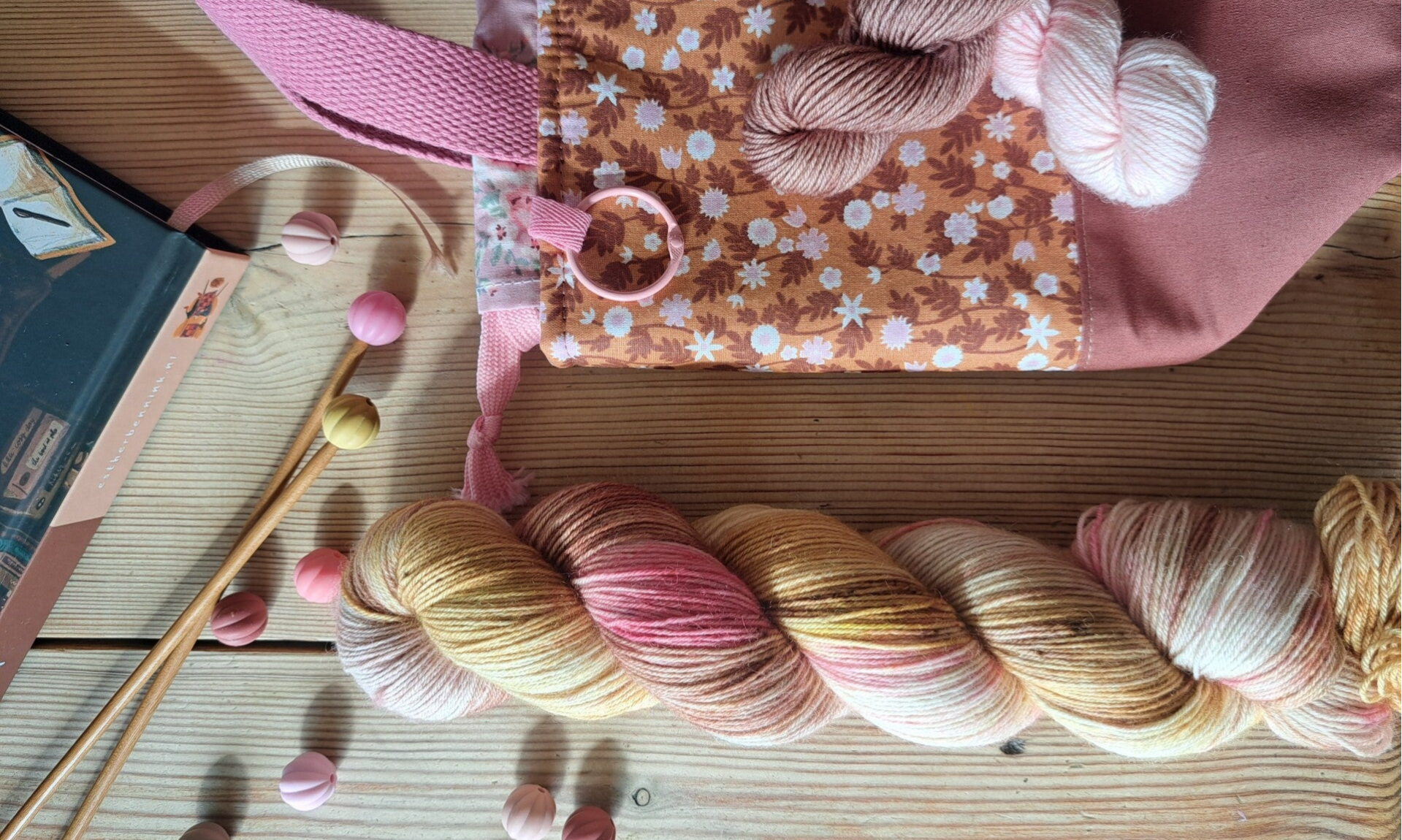 Exclusieve handgemaakte project bag: Een handwerktas van Ingrid, perfect voor 400-450 gram wol, met een klikring voor je steekmarkeerders en je favoriete schaartje.