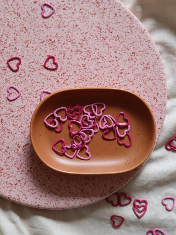 Een flinke set met metalen gesloten steekmarkeerders in hartjes-vorm. Licht- en donkerroze.