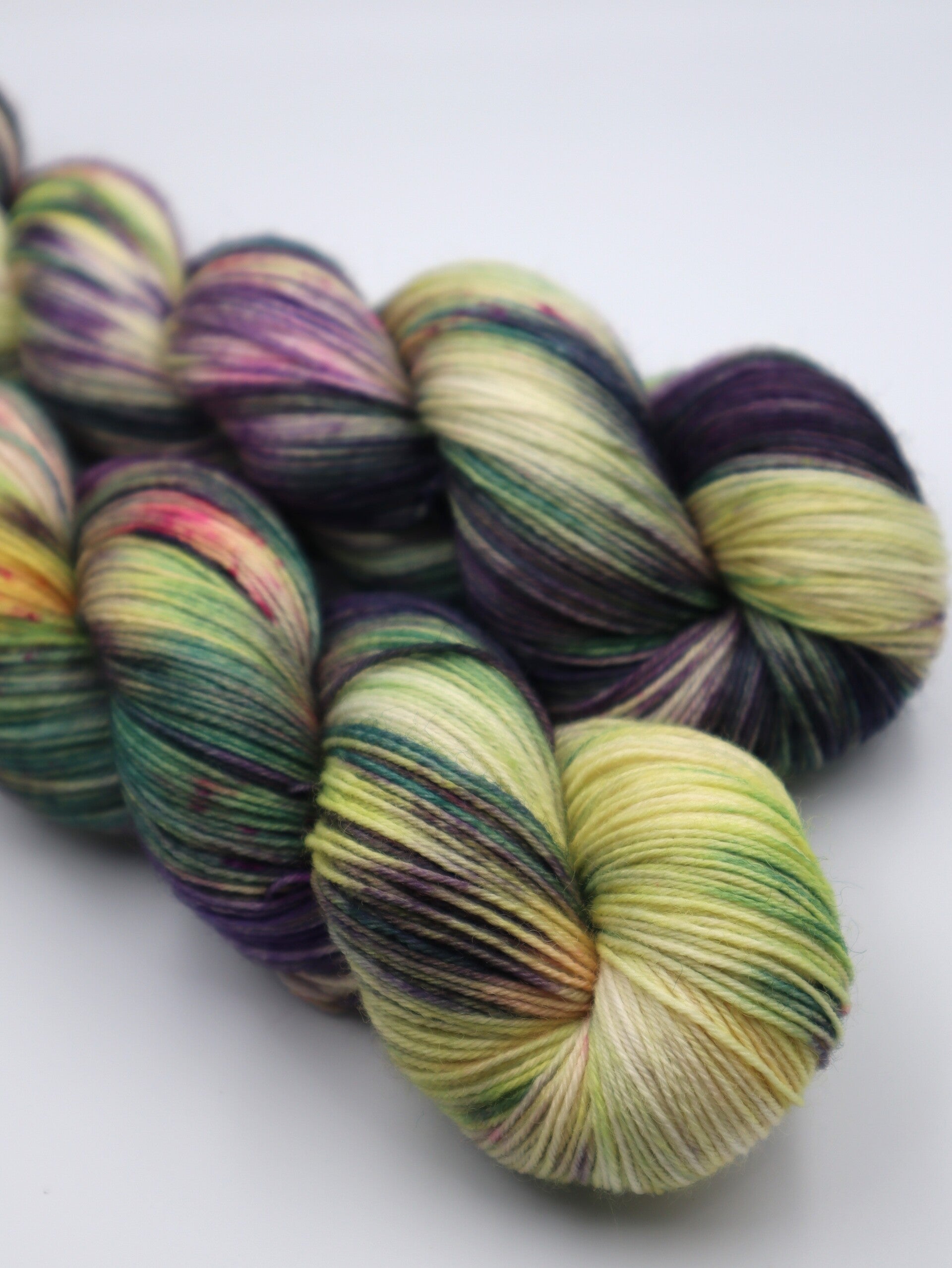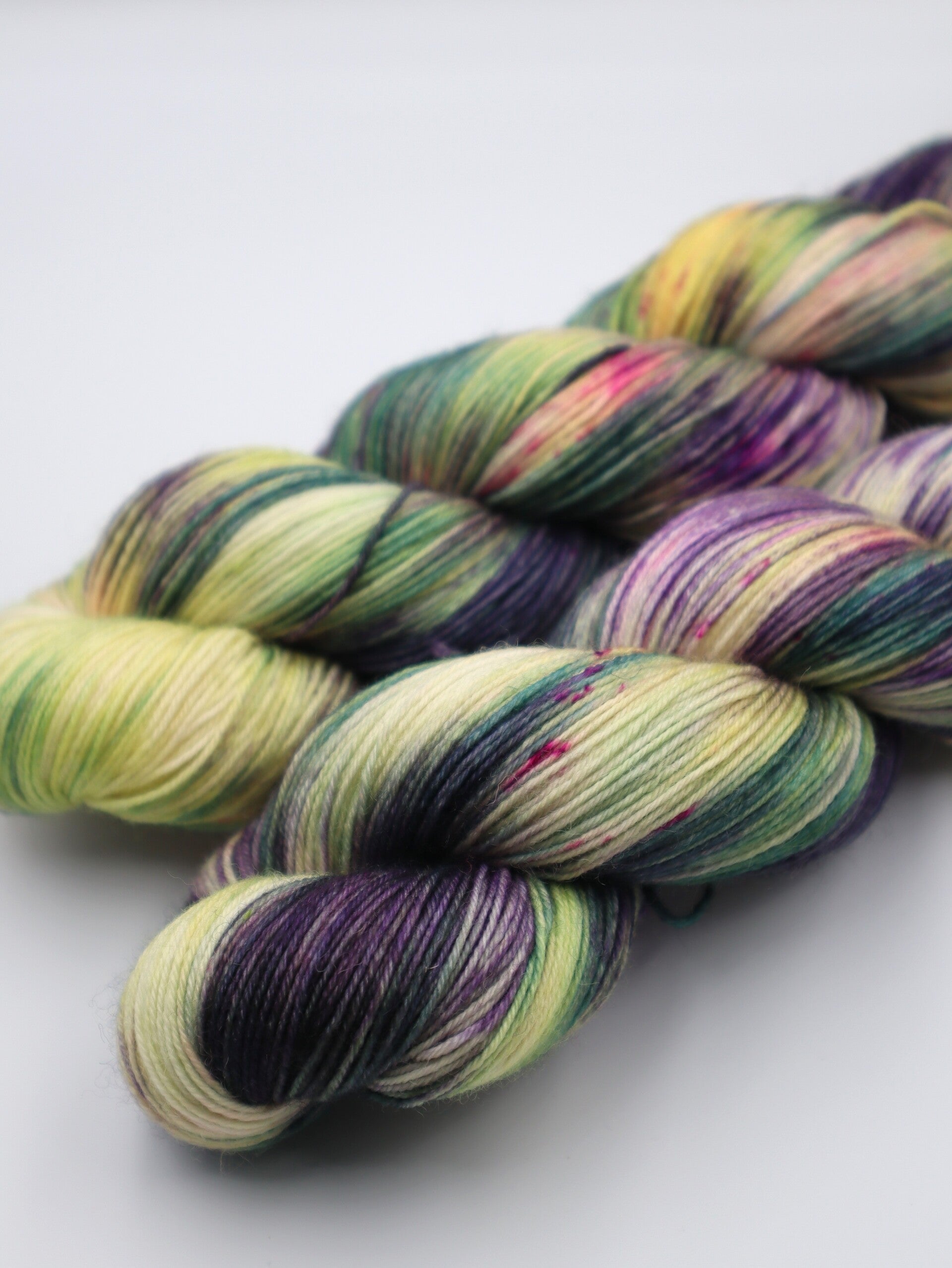 'Deze vrolijke frisse streng heeft een splashes dieppaars, zachtgeel, geel en groen en spikkeltjes knalroze'.