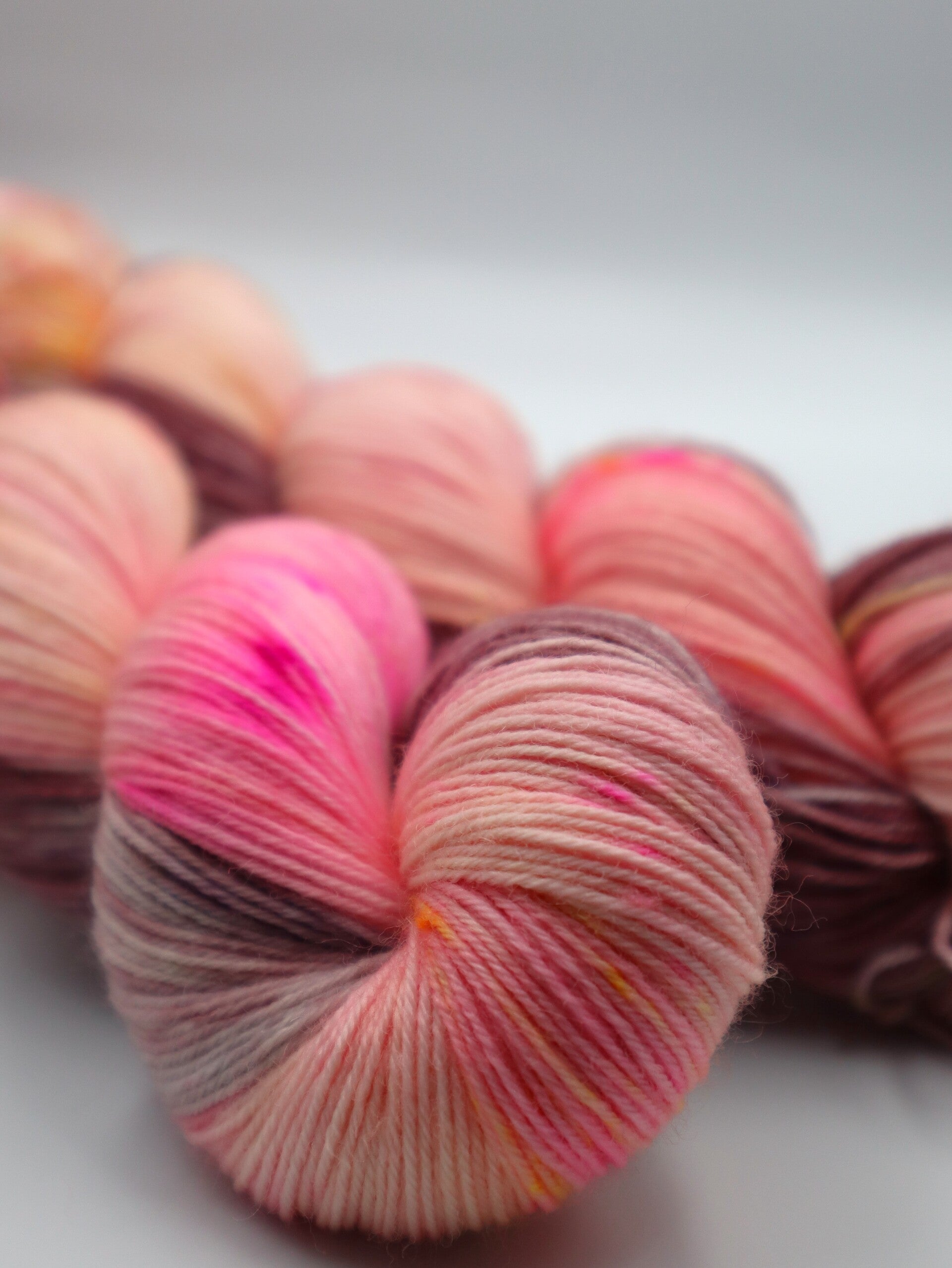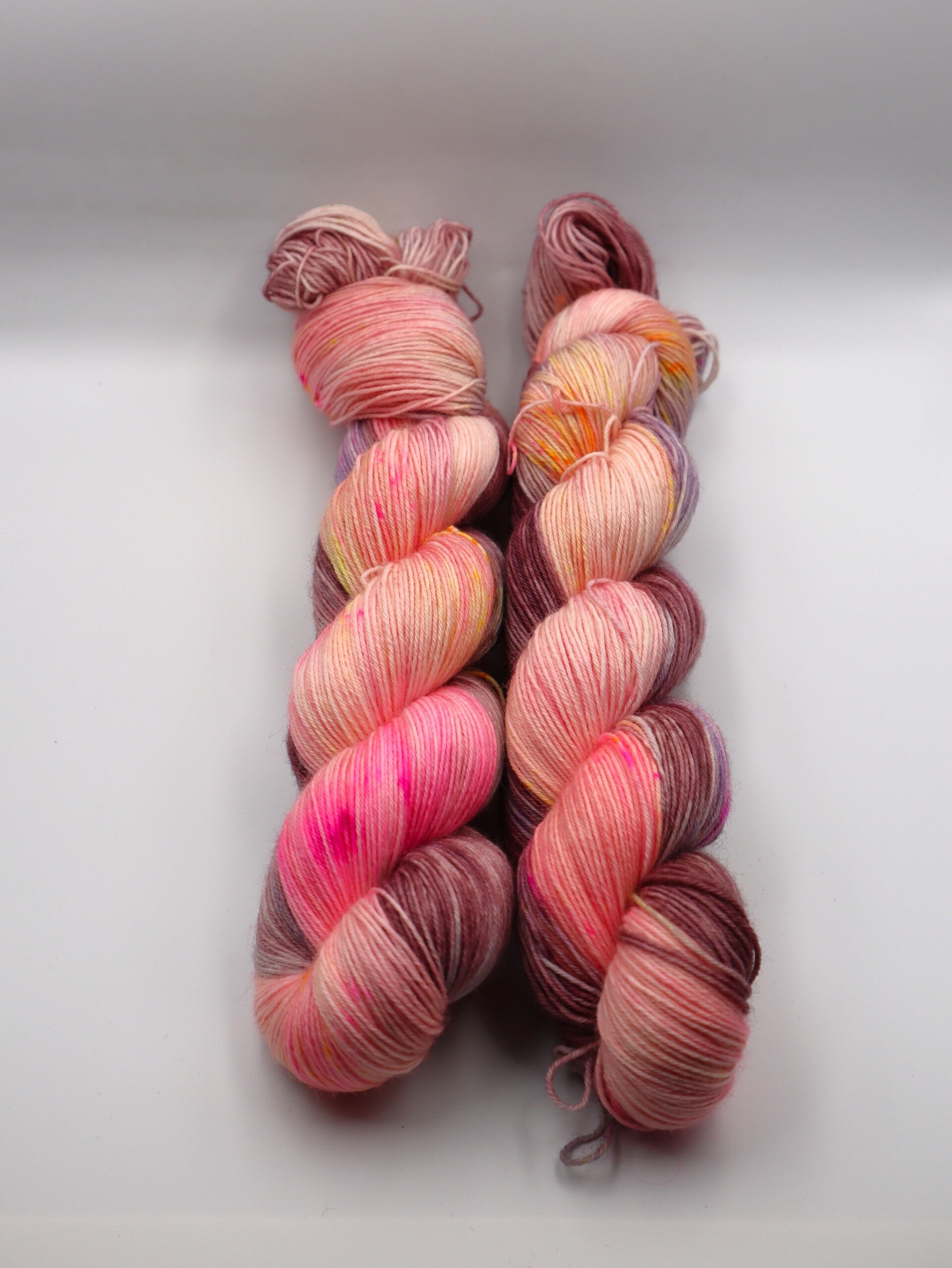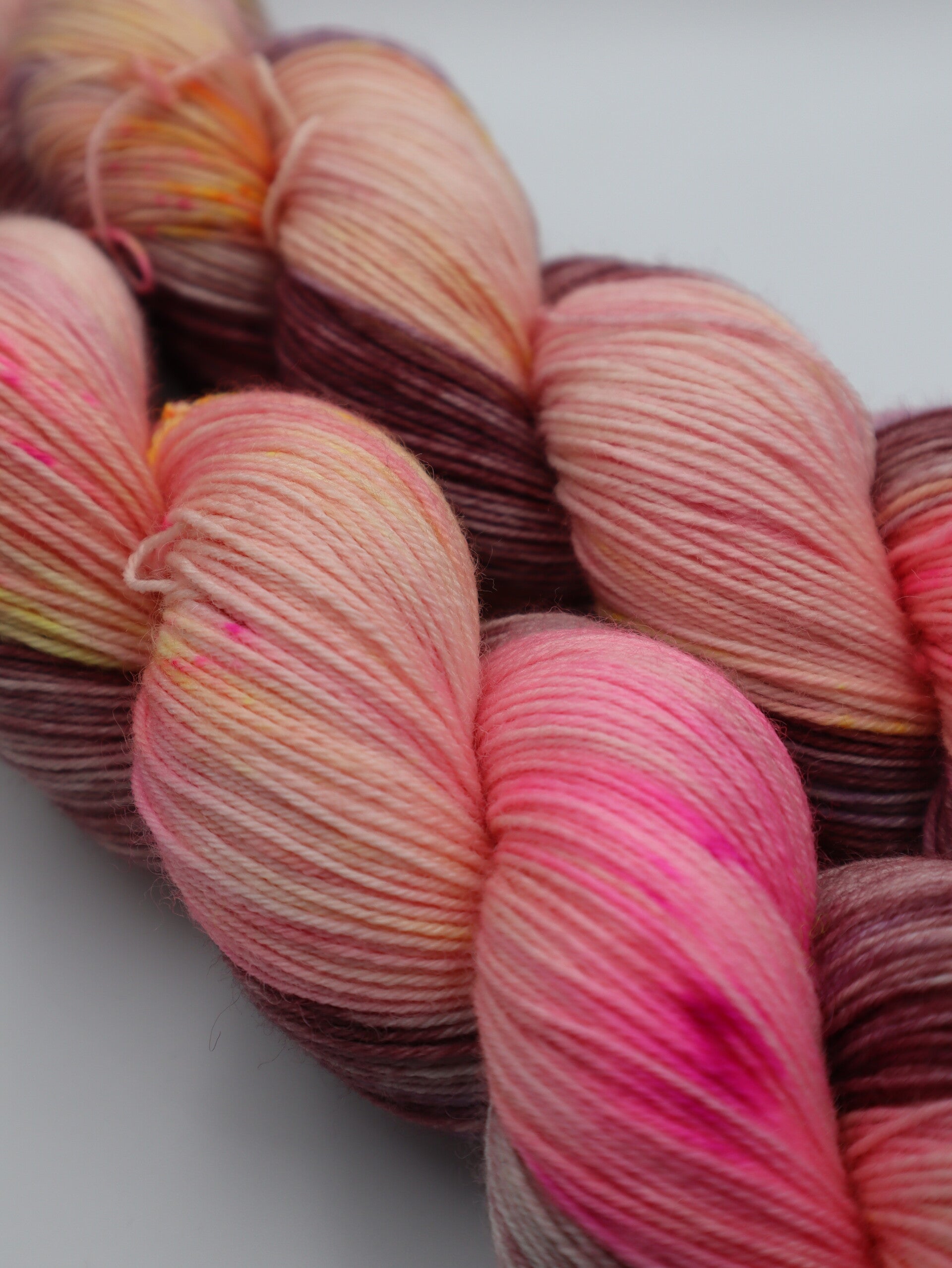 'Een vrolijke streng met een baby pink en mauve-paars basis en spikkels fel roze en geel '.