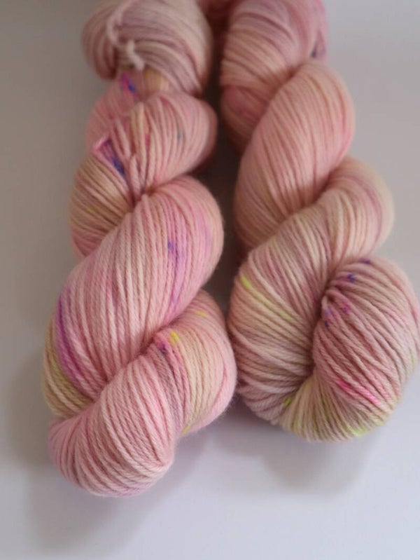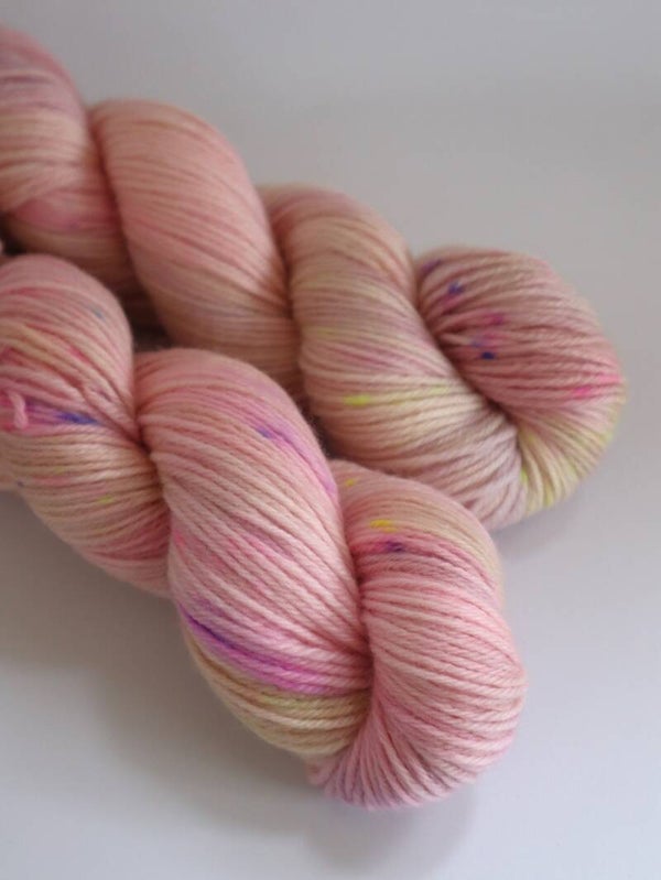 'Een lichte roze als basis, met perziktinten en lichtpaars. En vrolijke spikkels fel paars en neongeel'