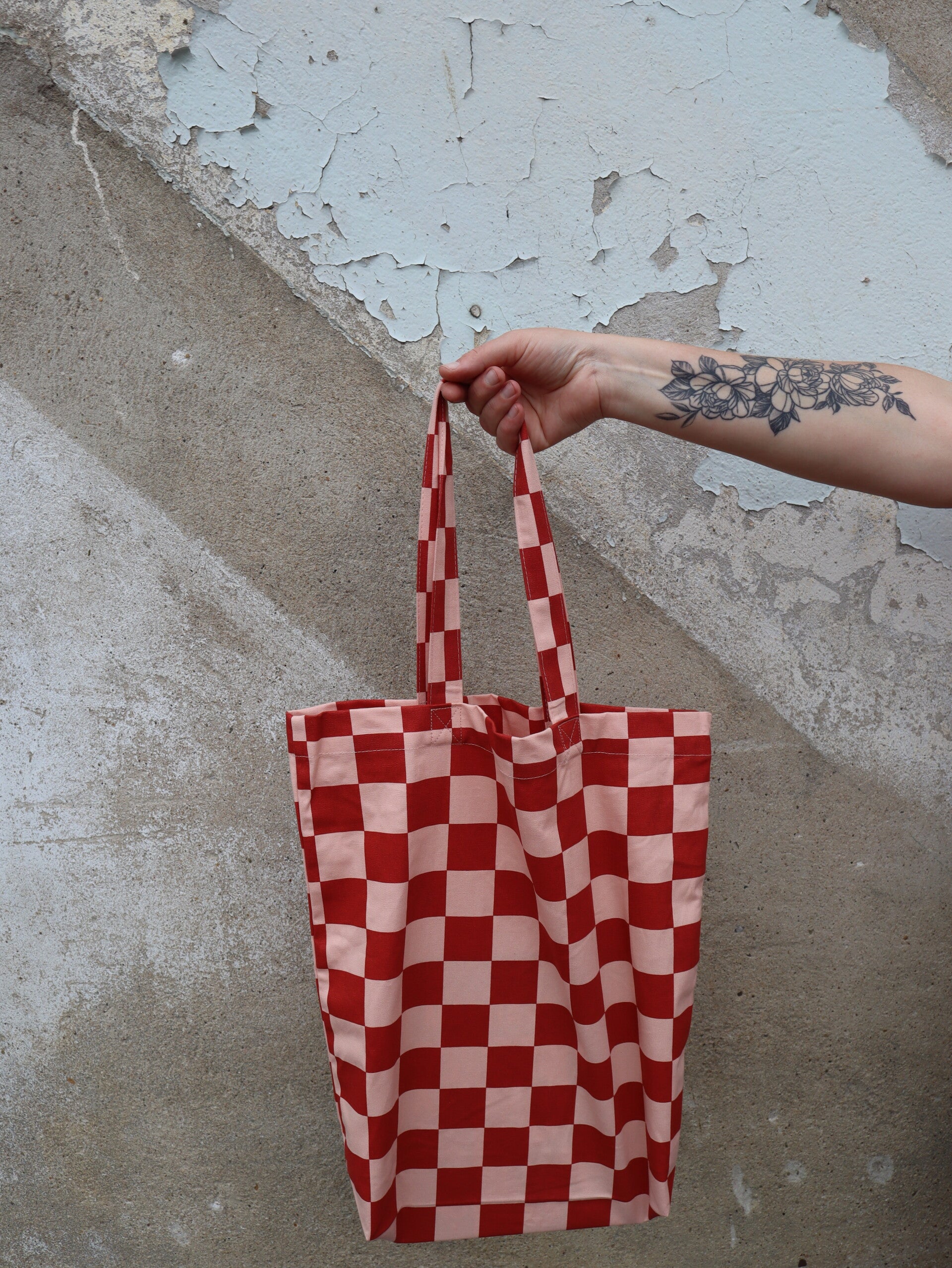 Een stevige canvas tas met blokbodem. In een toffe checkerboardprint in ginger met peach.