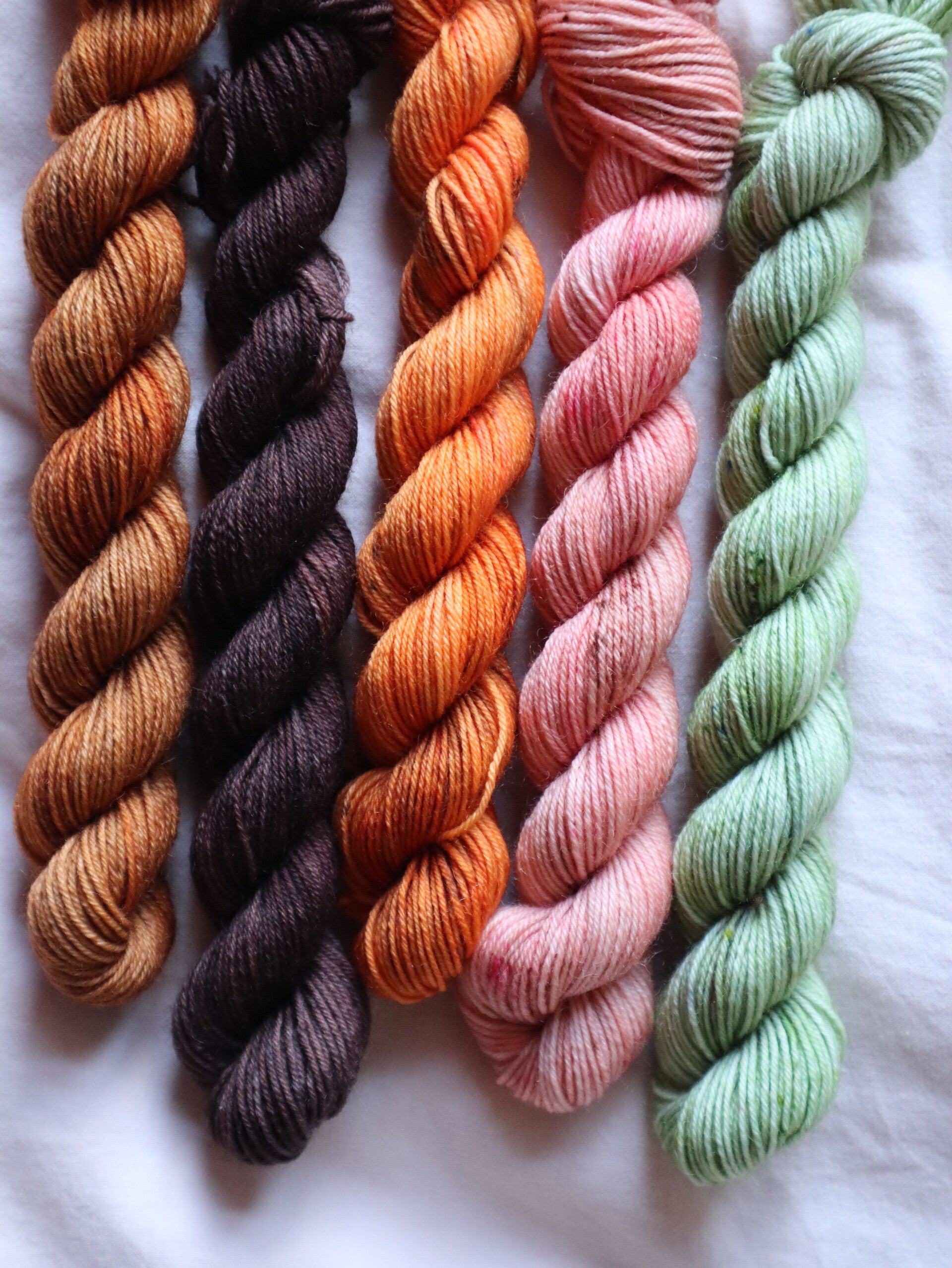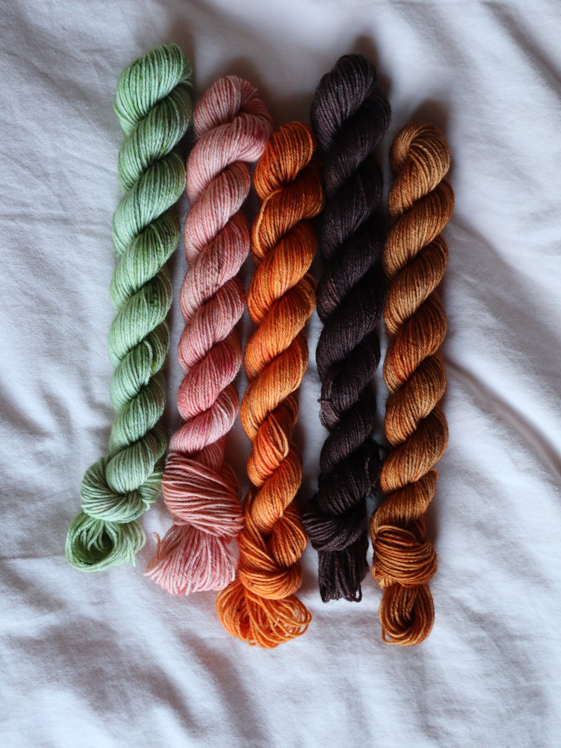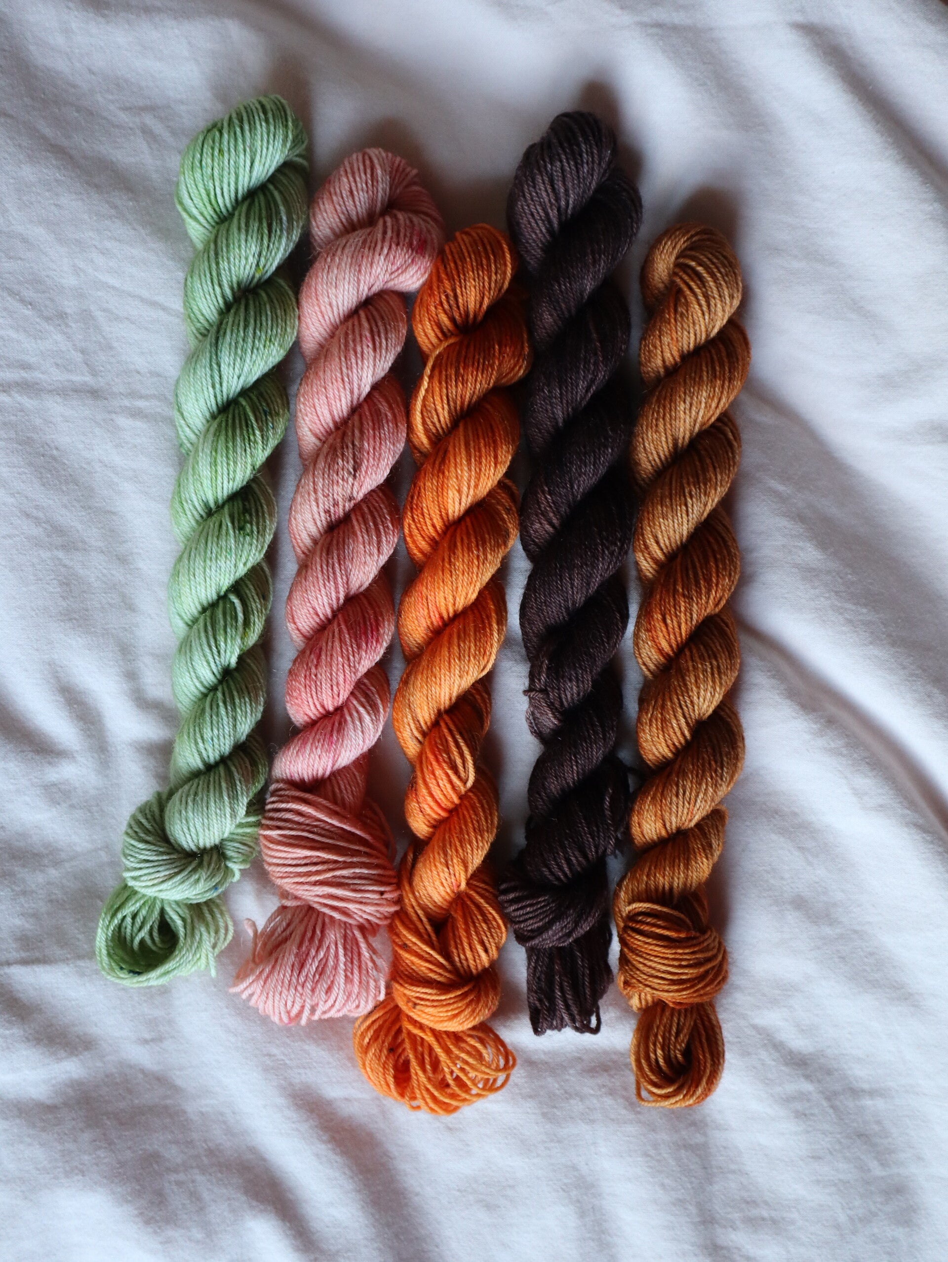 'Deze set bestaat uit 5 ministrengen in lichtgroen, caramel, oud roze, oranje en diep donkerbruin'