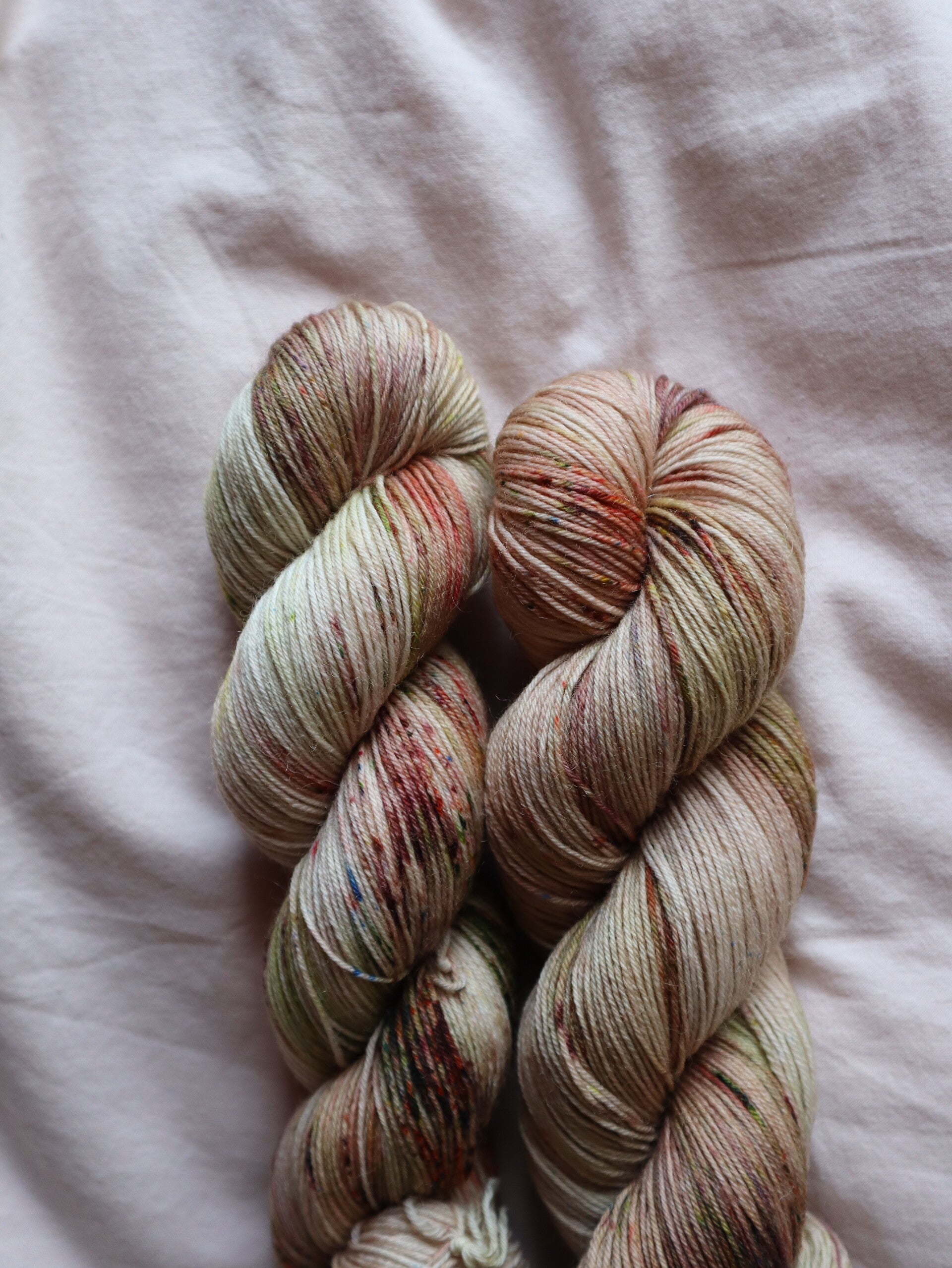 'Een streng vol spikkeltjes in najaarstinten; bruin, groen en oranje'.