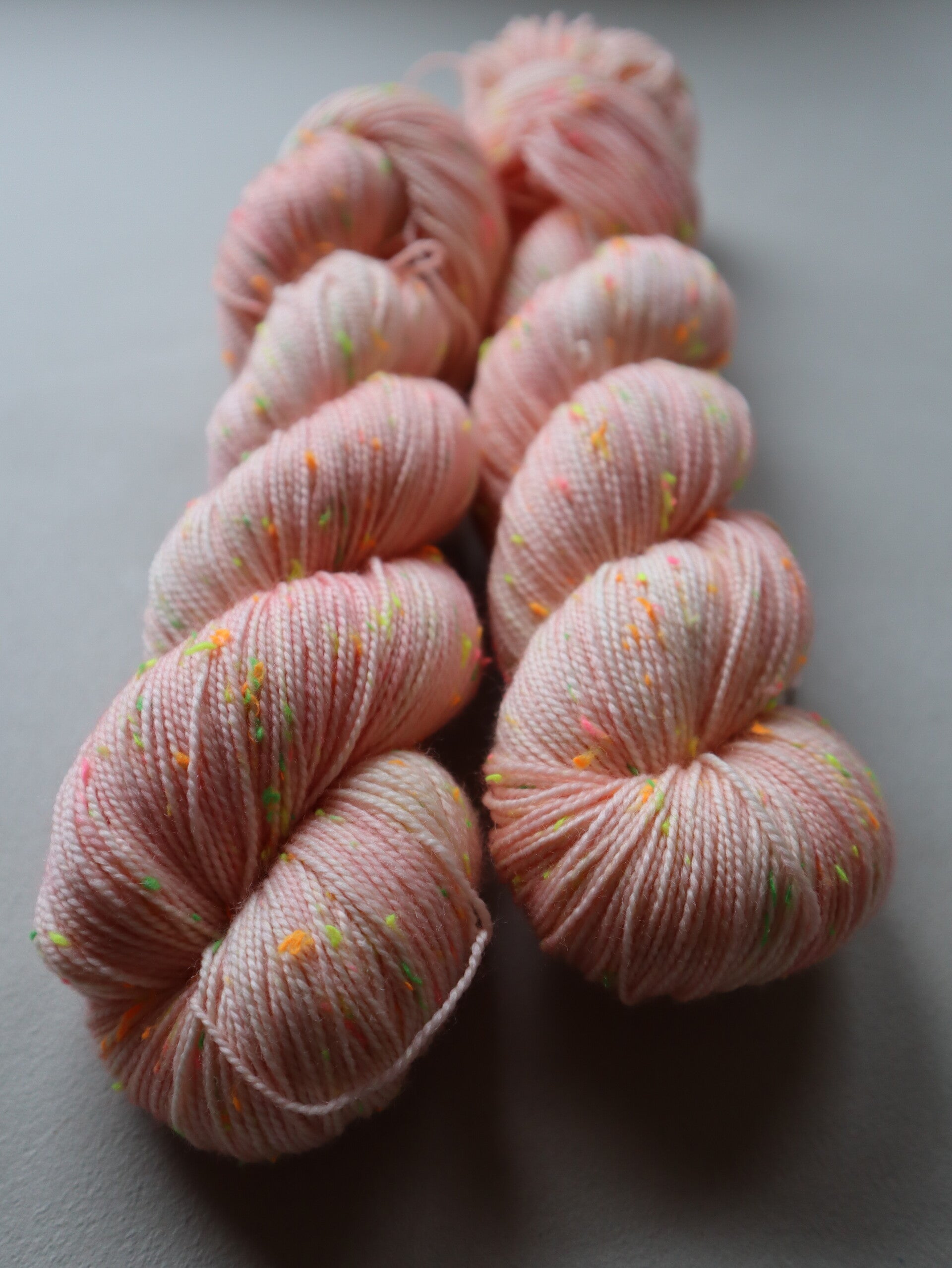 Een vrolijke noot in de collectie. Dit is wel een heel bijzonder tweedgaren. Een heerlijke zachte merino, met kleine spikkeltjes in neongroen, neongeel en neonroze. Dit fingering weight garen is veelzijdig te gebruiken; voor een fijne trui bijvoorbeeld of een warme muts of lekkere sjaal...