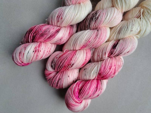 'Deze streng is speciaal geverfd voor Valentijnsdag; een ode aan de liefde. De streng heeft een offwhite basis en spikkels hot pink, roze, rood en donker bruin'.