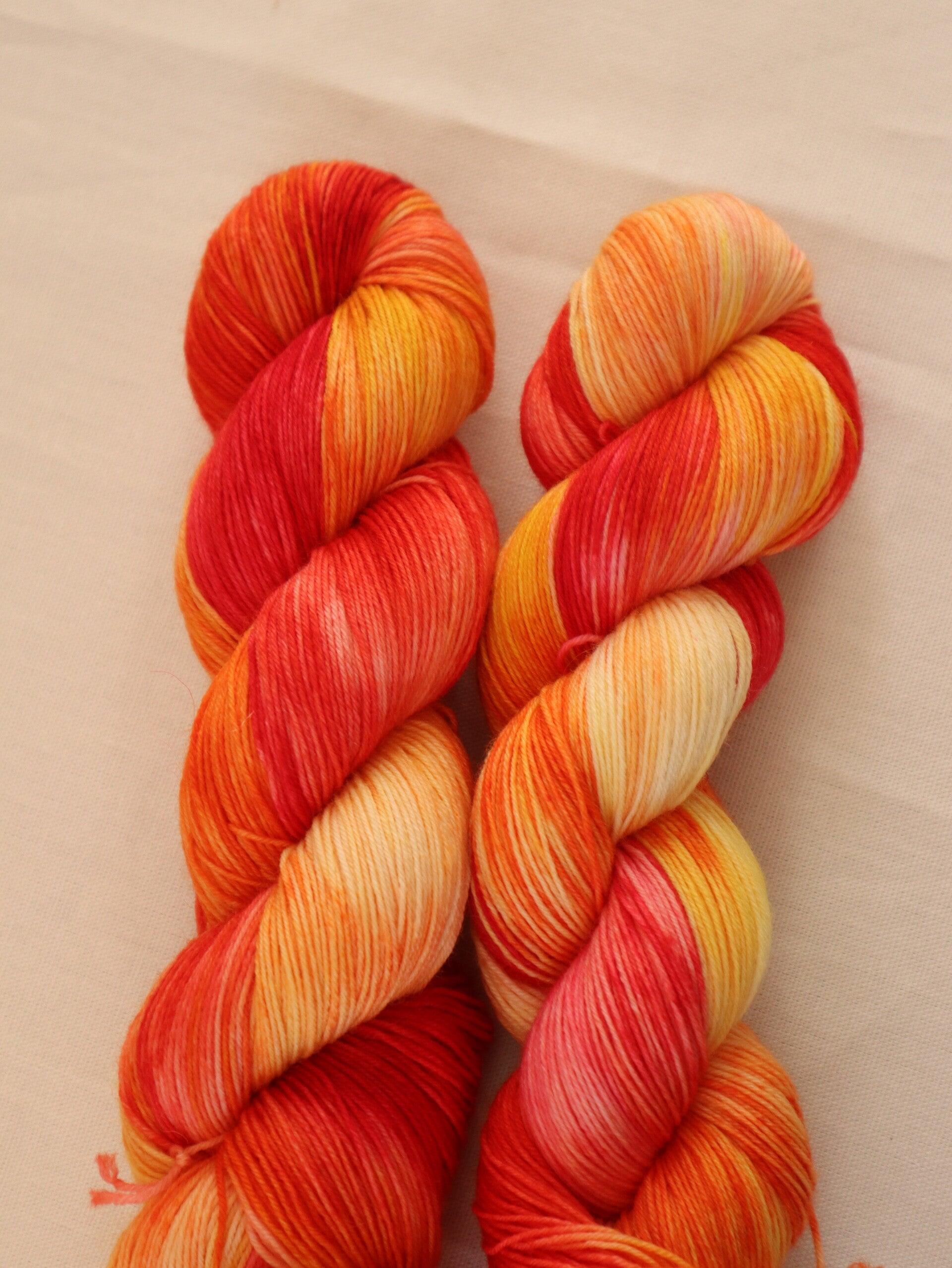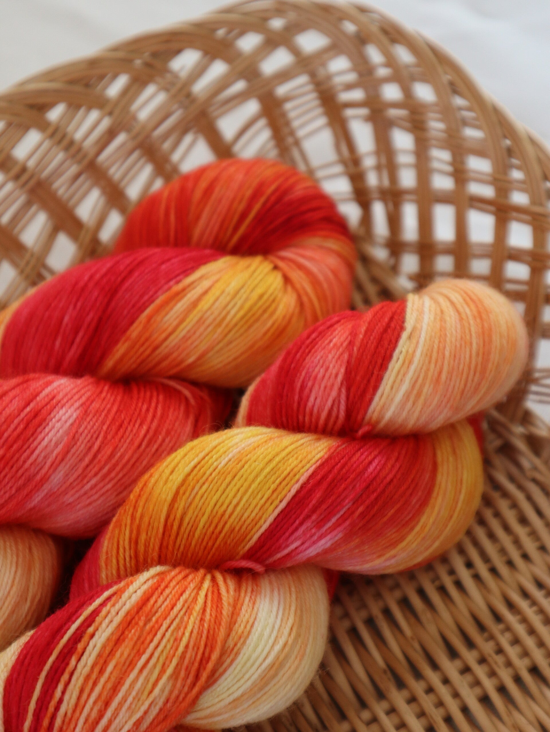 Deze toffe streng is heel speciaal, want het werd niet door mij ontworpen, maar door Inge op het K2P2-festival. Het is een vrolijke streng met verschillende tinten geel, oranje en rood.
