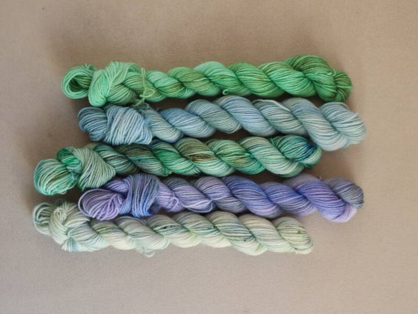 'Deze set bestaat uit 5 ministrengen in verschillende blauw, groen en paarstinten'