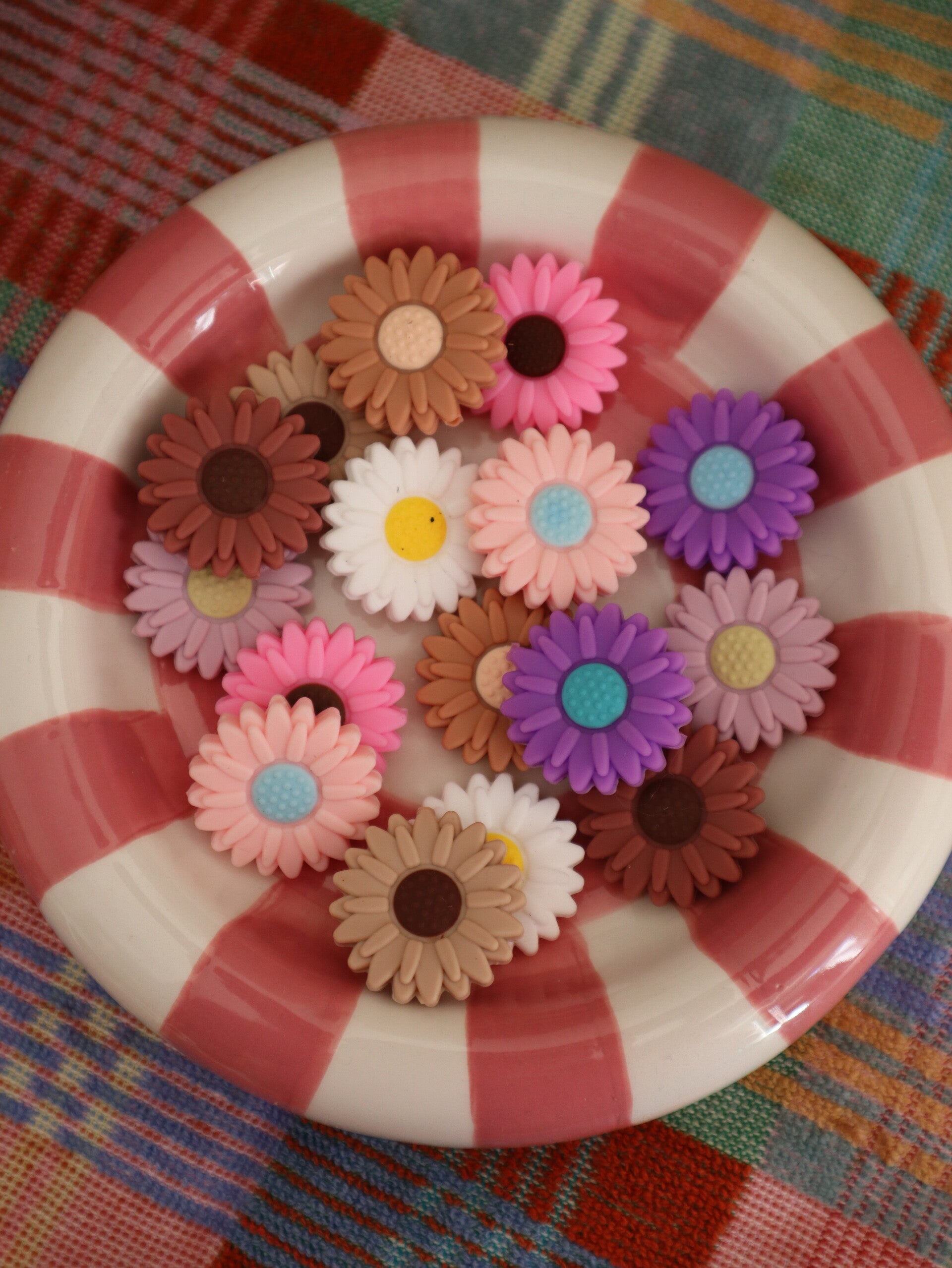Een setje van 2 bloemen, diameter: 2,7 cmMateriaal : siliconenKleur: Paars met een blauw hartje