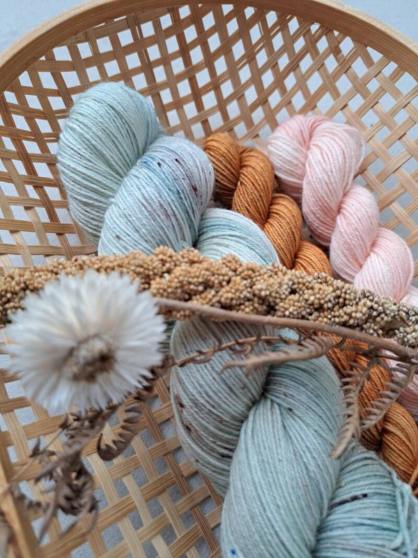 Een fijne sockset op BFL-sockbasis, bestaande uit een 100 grams streng in verschillende lichte salie / oudgroentinten, met spikkeltjes aubergine. Daarnaast 2 20 grams mini's, waarvan eentje warm caramel is en de ander licht zalm.