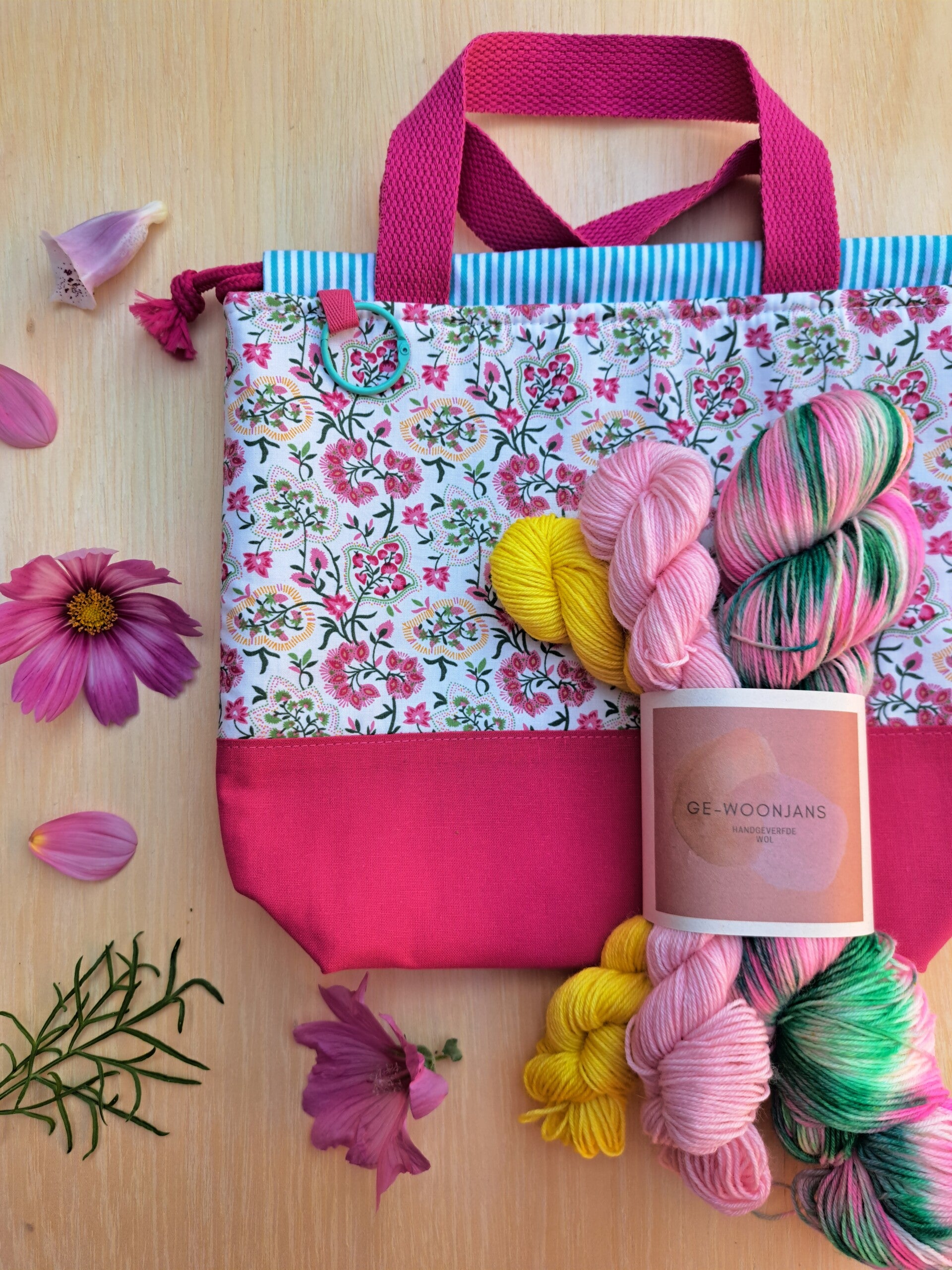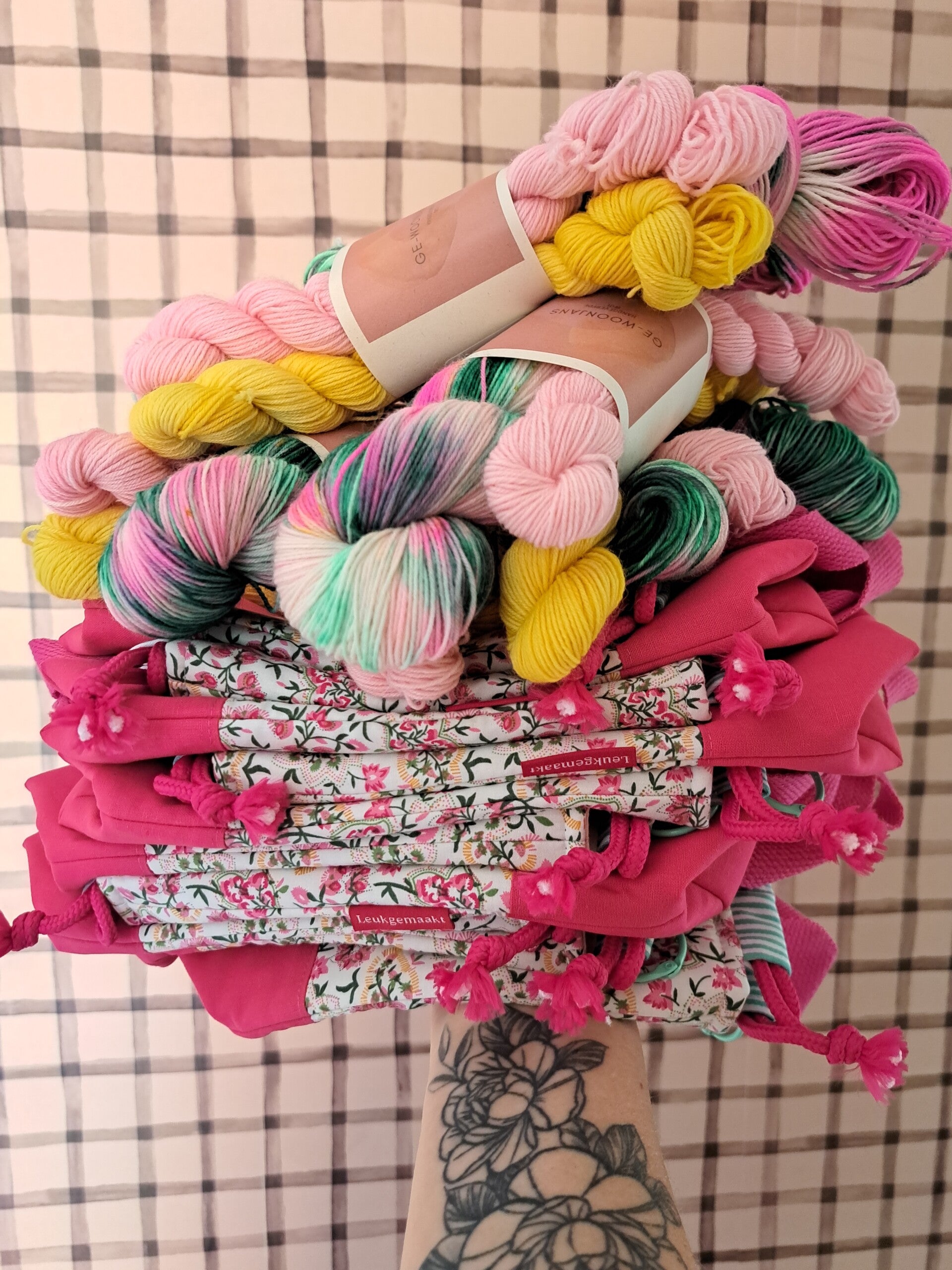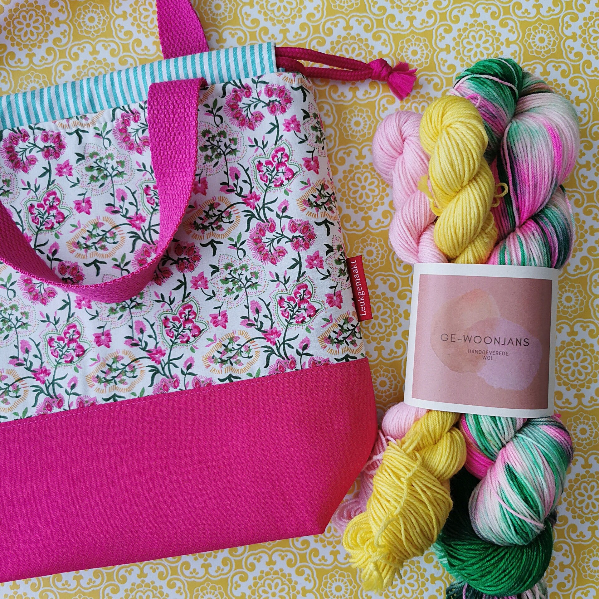 De Gewoon Leuk Box is een samenwerking tussen Ge-woonjans en Leukgemaakt. Ik verfde de wol en Ingrid naaide projectbags in bijpassende zomerkleuren. Het resultaat is een prachtige set waarmee jij creatief aan de slag kunt.