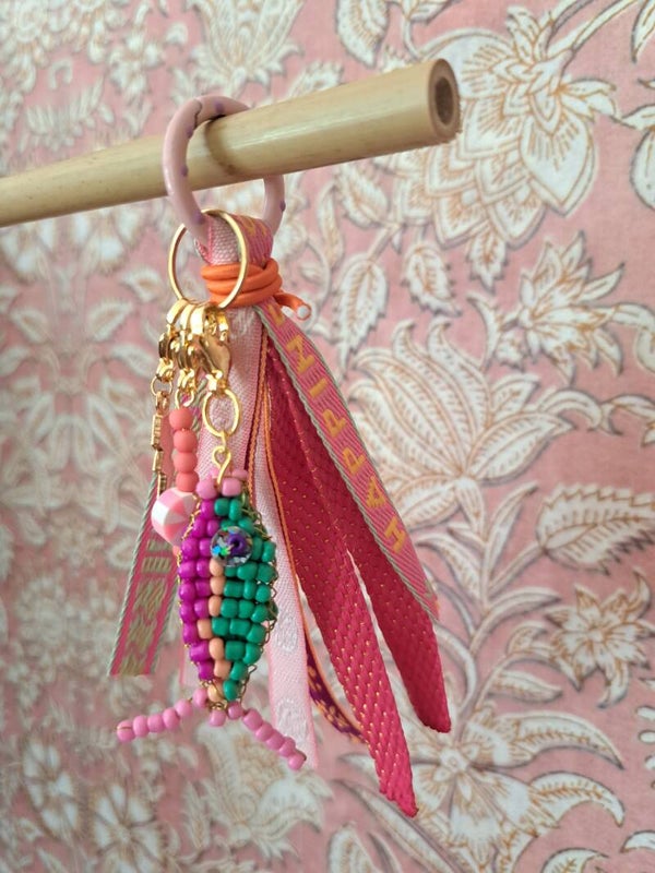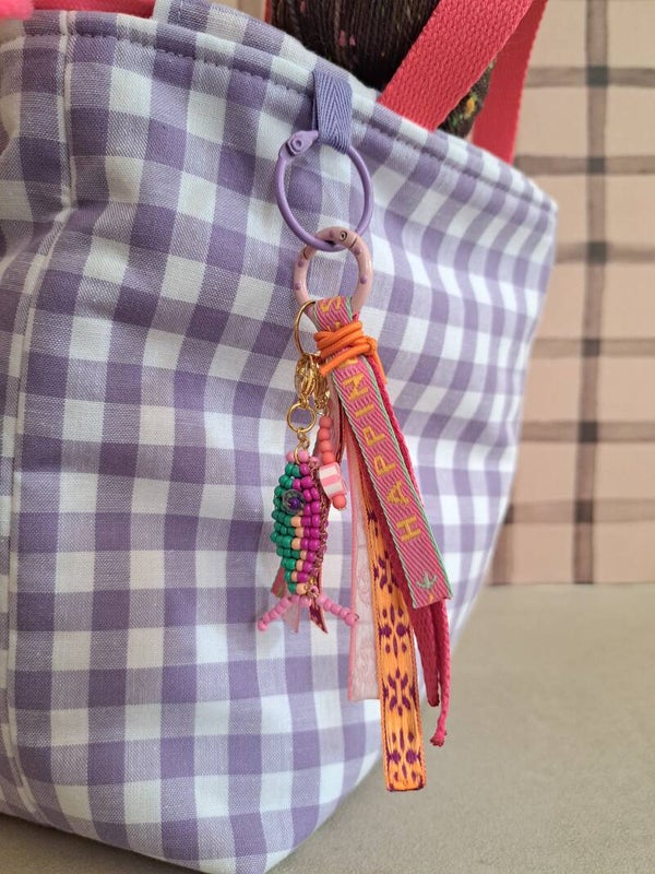 De bagcharm bestaat uit een metalen keychain, die je open kunt klikken, 3 bedels (waaronder het toffe handgemaakte kralenvisje) en vrolijke festivallintjes.