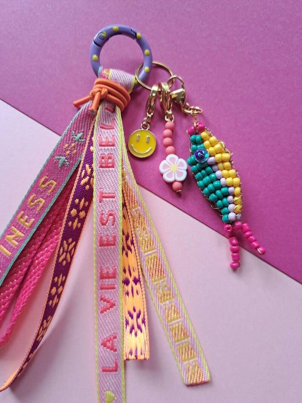 De bagcharm bestaat uit een metalen keychain, die je open kunt klikken, 3 bedels (waaronder het toffe handgemaakte kralenvisje) en vrolijke festivallintjes.