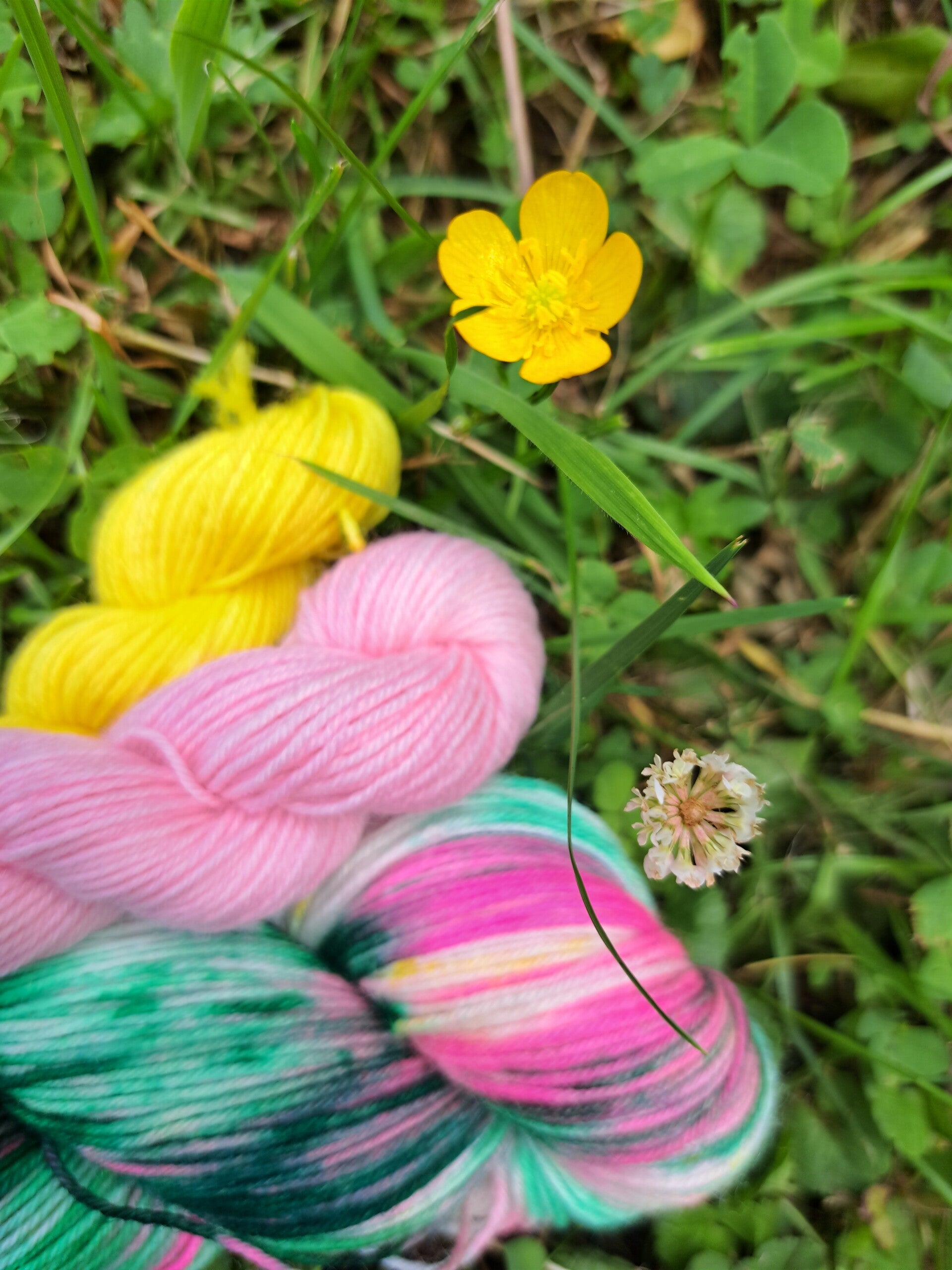 Een fijne sockset op BFL-sockbasis, bestaande uit een 100 grams streng in groen en roze tinten, met splashes geel. Daarnaast 2 20 grams mini's, waarvan eentje licht roze is en de ander vrolijk geel.