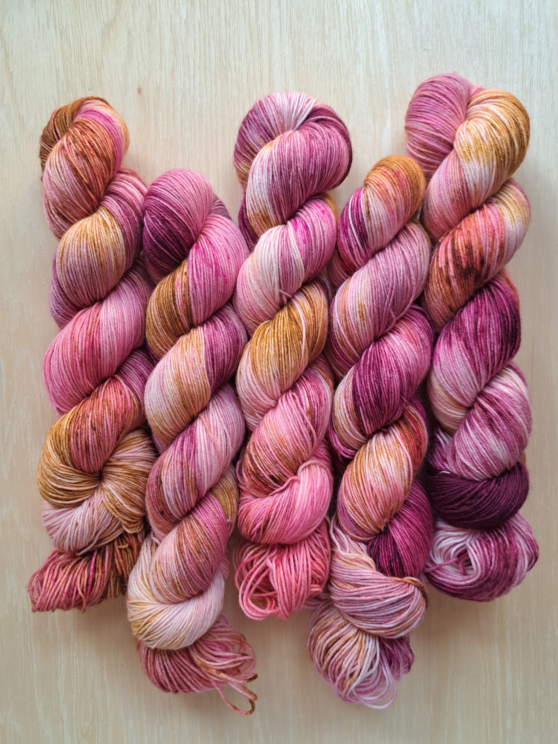 Deze streng heeft verschillende roze nuances, lila en pruimkleur en okergeeltinten.