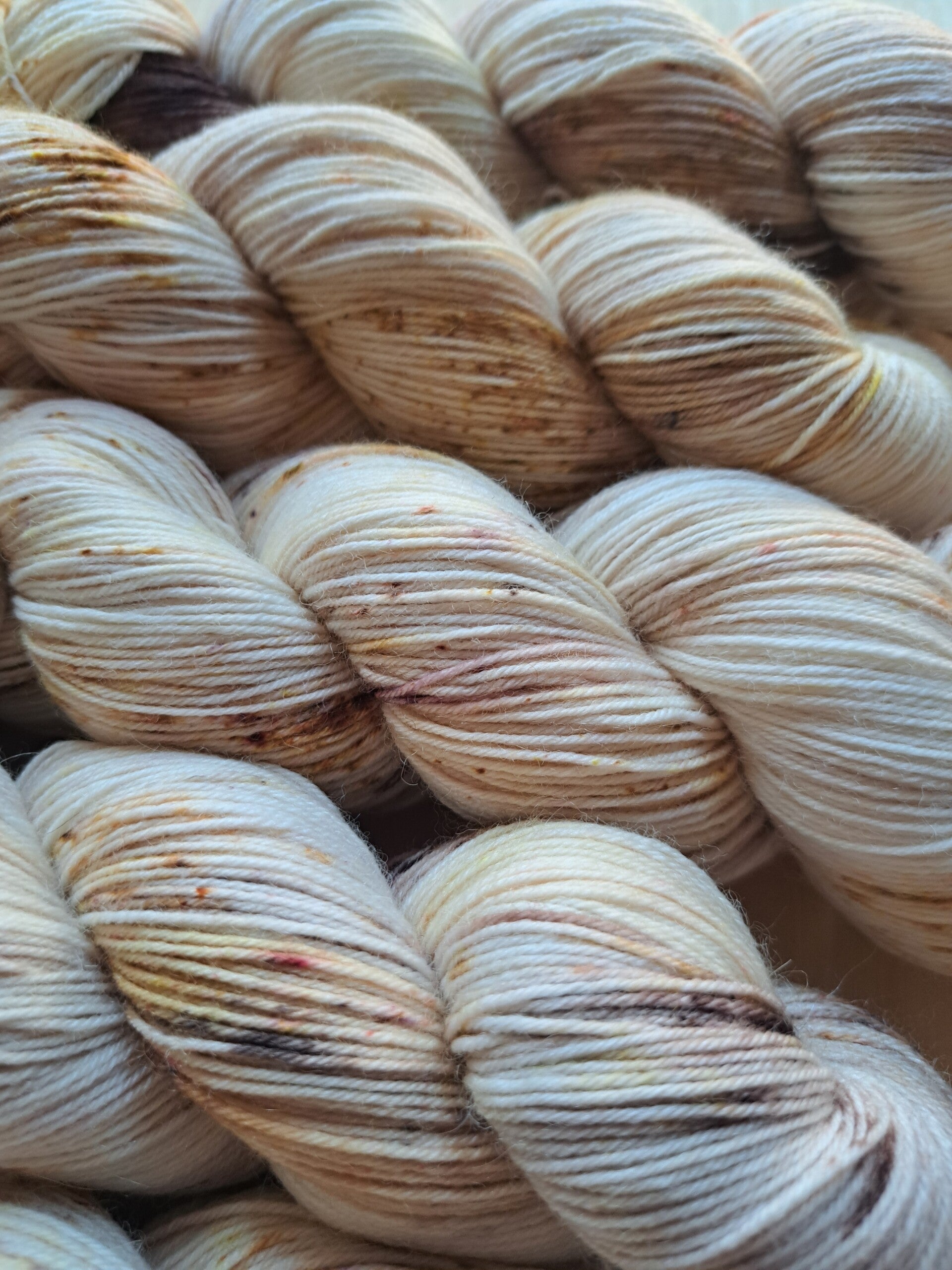 Deze streng heeft een offwhite basis, met verschillende bruin en oker spikkels.