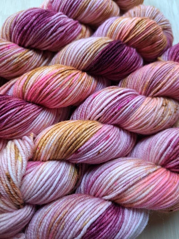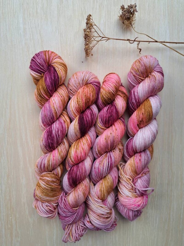 Deze streng heeft verschillende roze, paars en carameltinten.