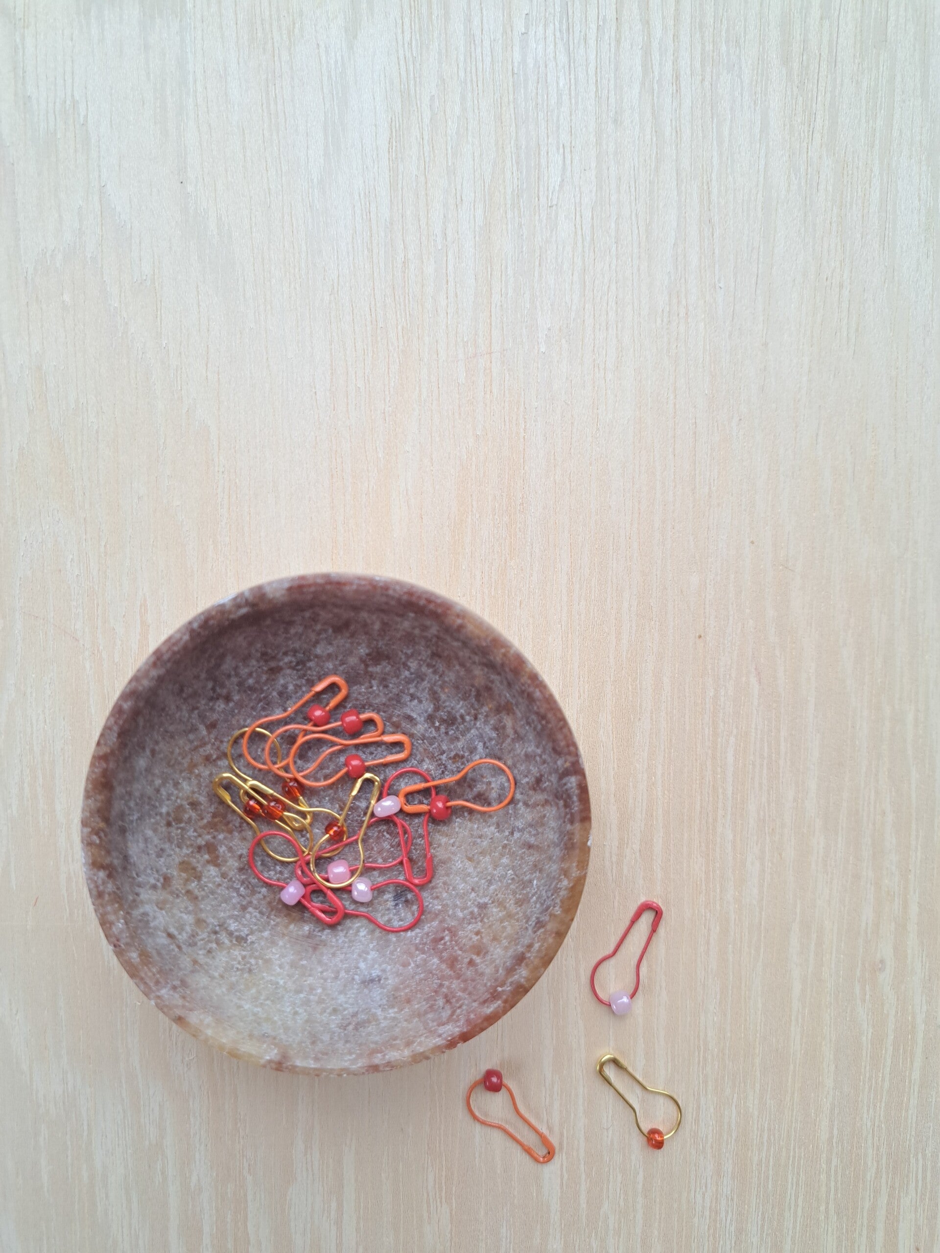 Een setje met 15 metalen steekmarkeerders. Iedere steekmarkeerder is versierd met een glaskraaltje.