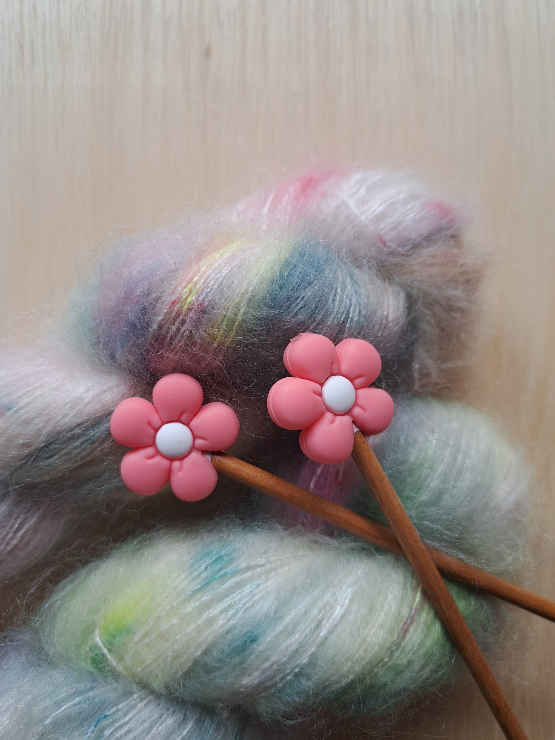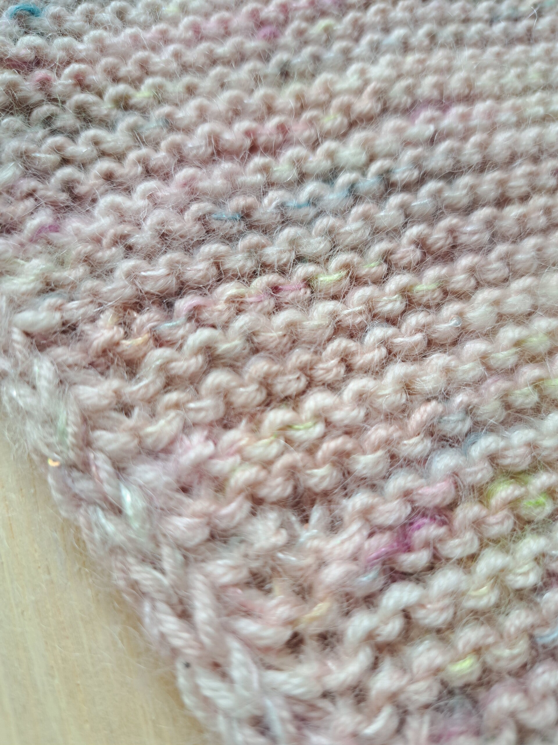 Deze streng heeft verschillende zachte pasteltinten, met een vleugje neon; groen, teal en roze.