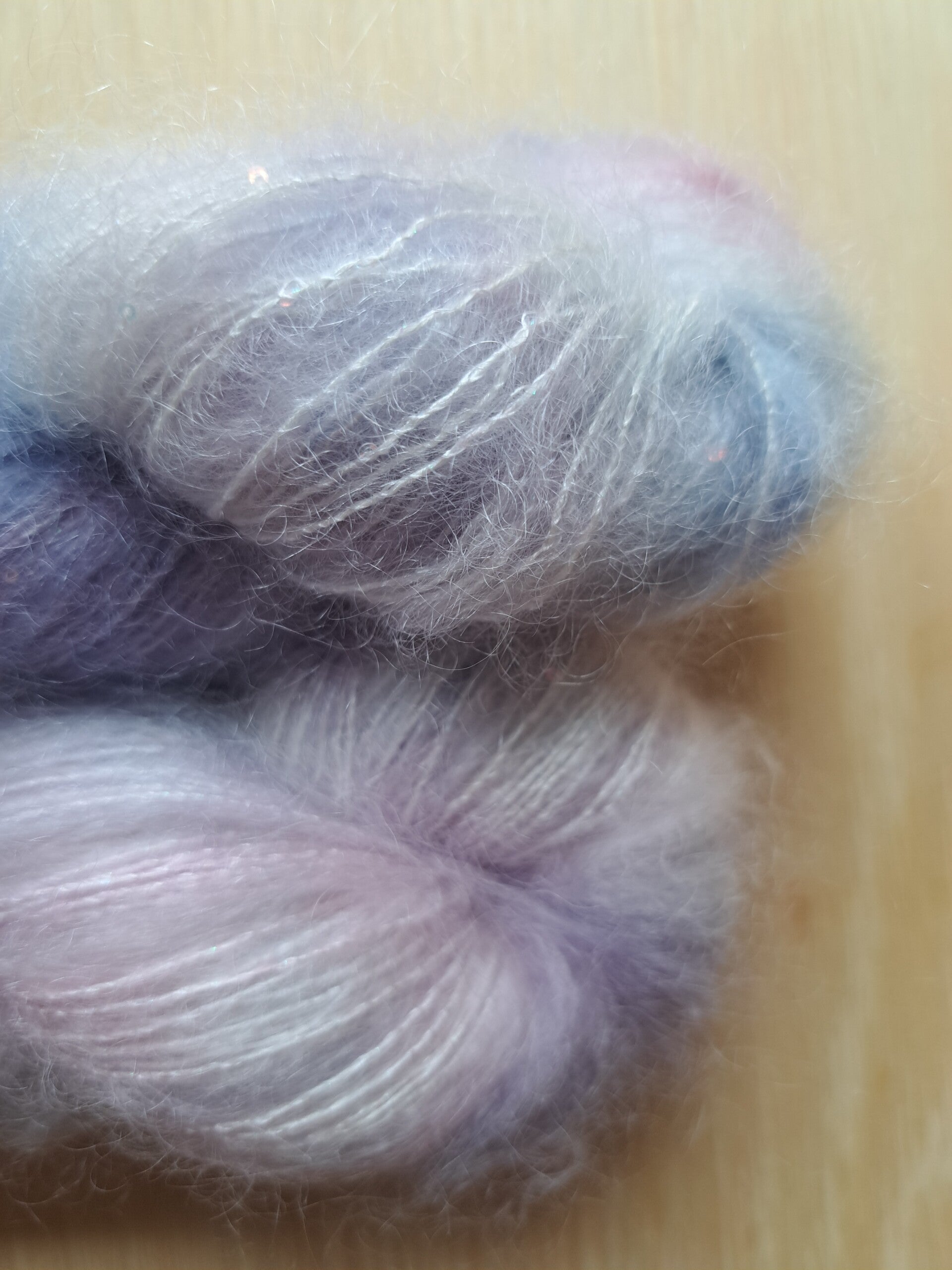 De luchtige mohair zorgt voor een heerlijk zacht en pluizig effect, terwijl de zijde een elegante glans en extra sterkte toevoegt. De fijne pailletjes vangen het licht op een subtiele manier, waardoor je werkstuk een sprankelend accent krijgt zonder overheersend te zijn.
