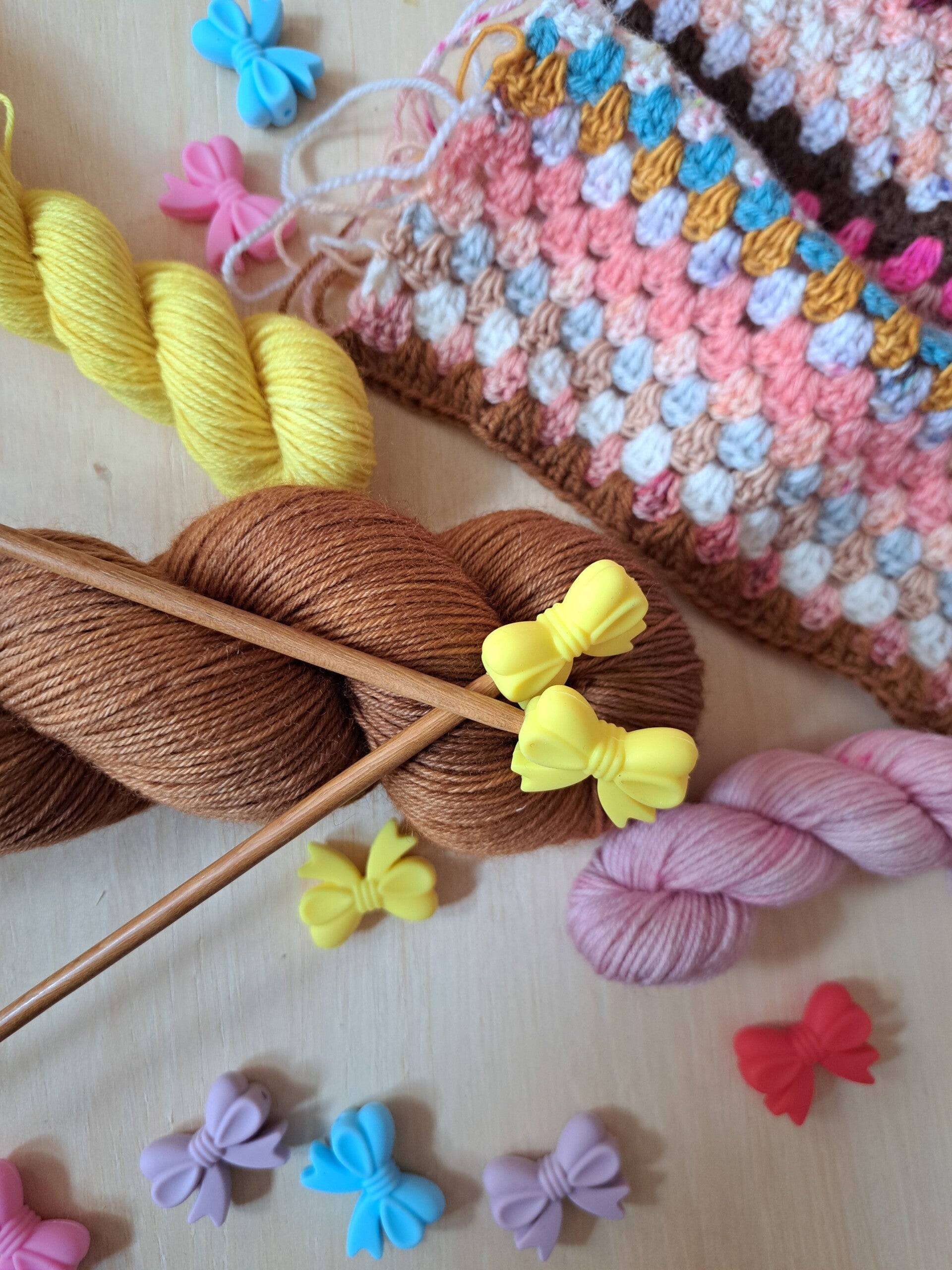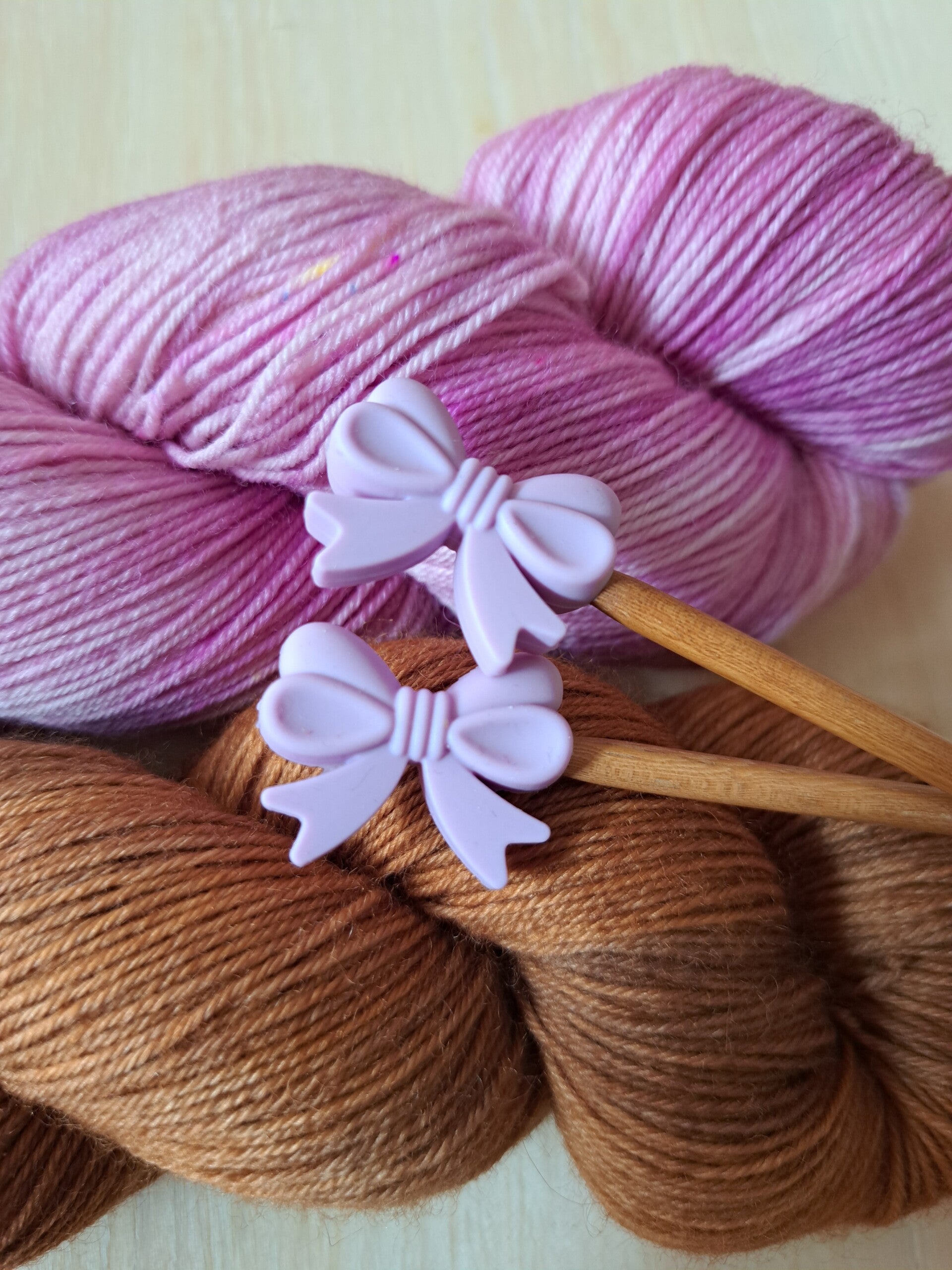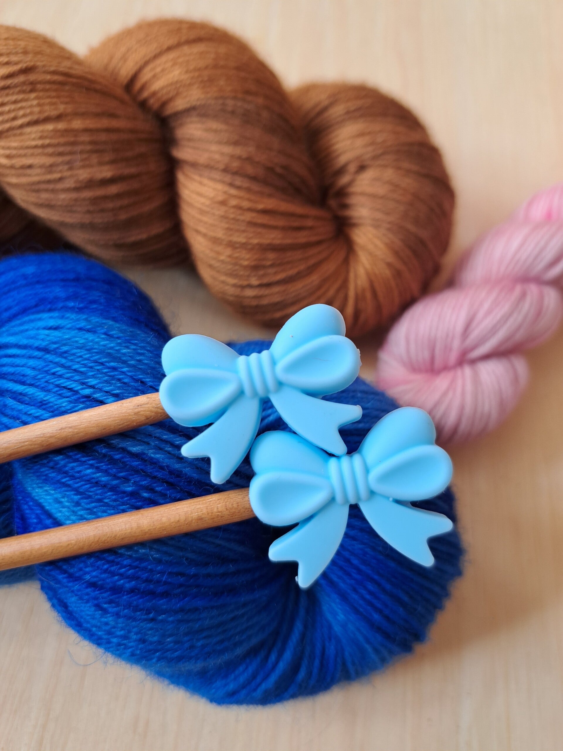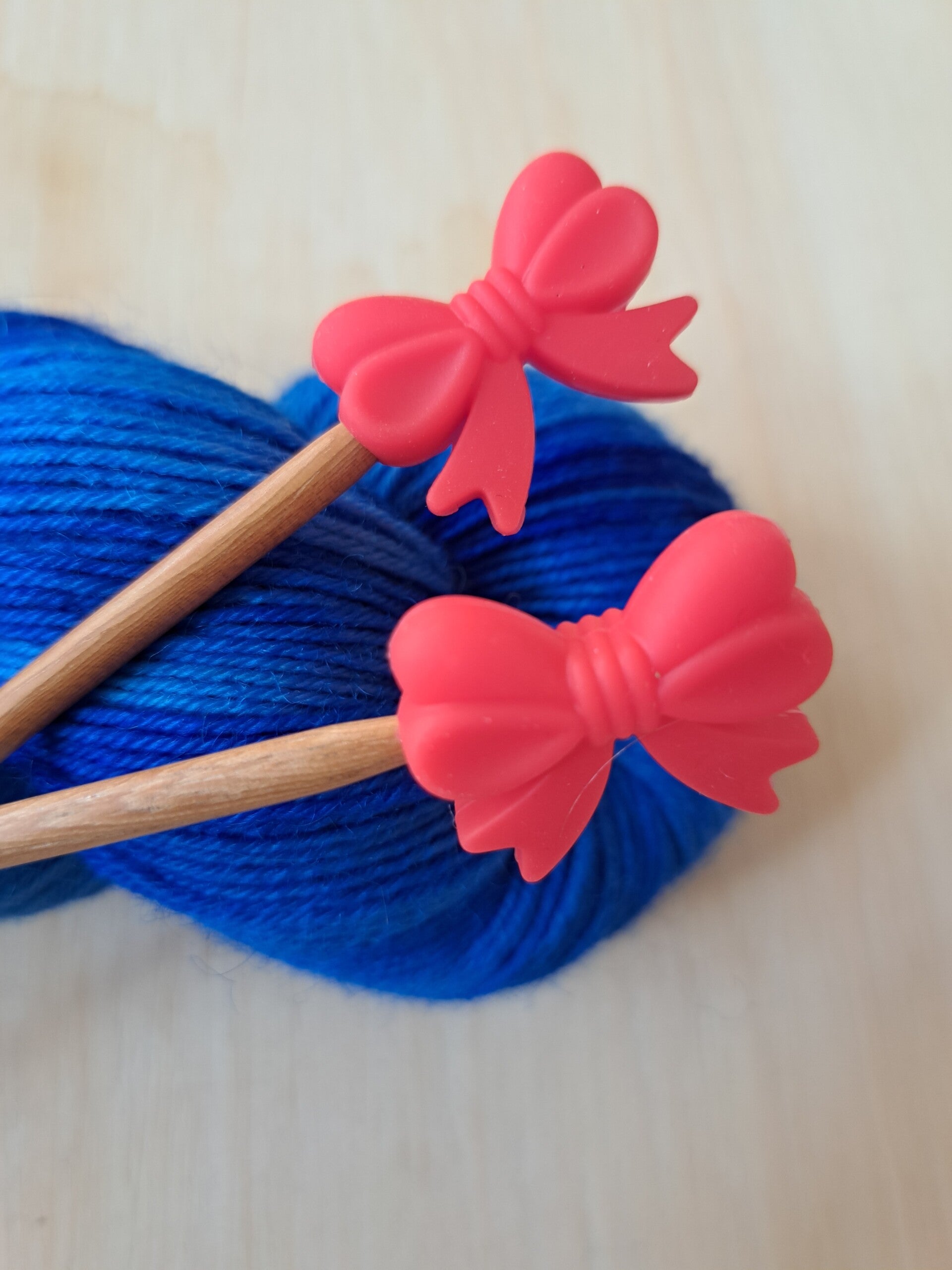 Hoe leuk zijn deze breistoppers van siliconen, in de vorm van een strikje? Nooit meer je steekjes laten vallen, als je een werkje weglegt...