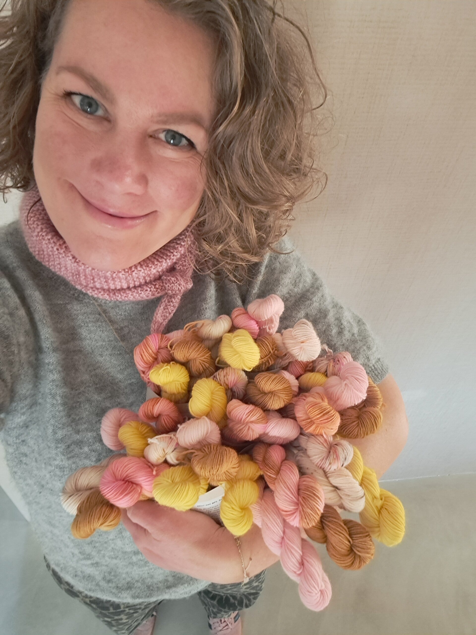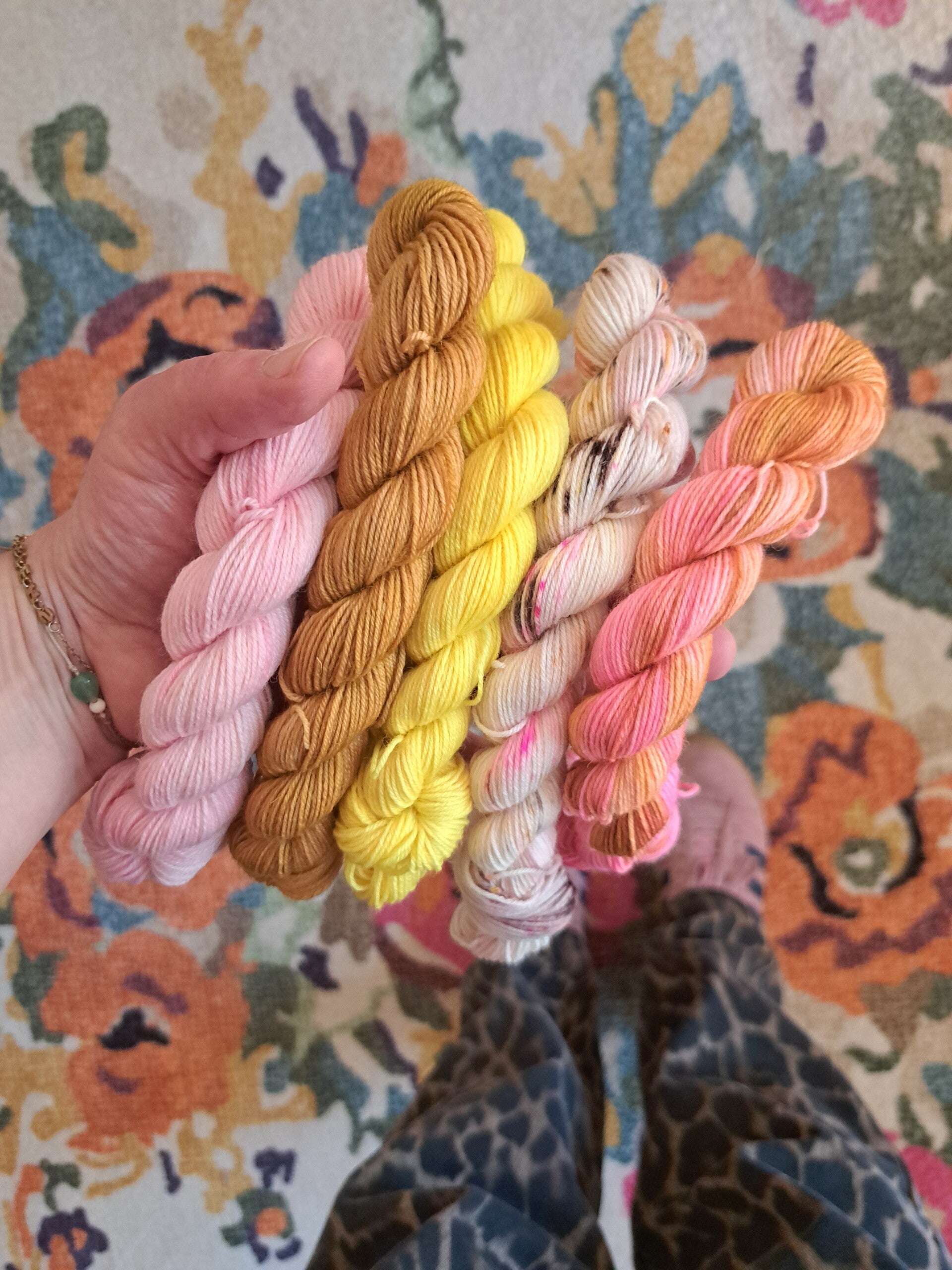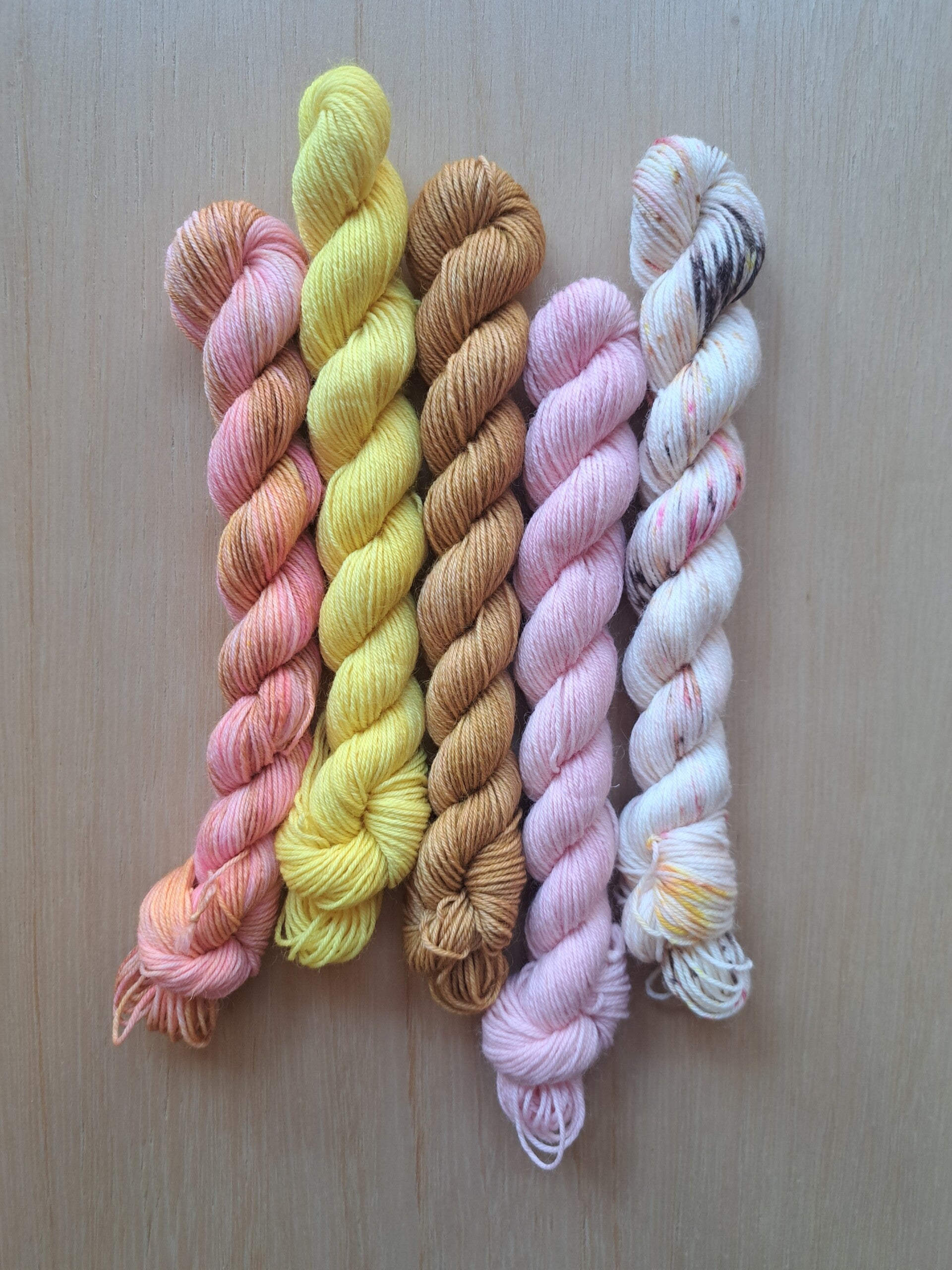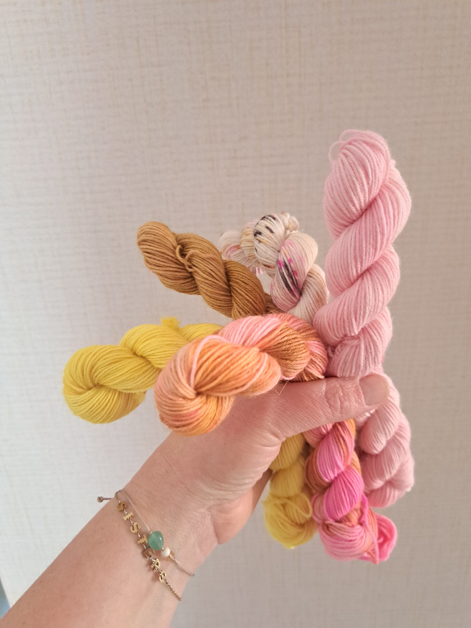 De kleuren lopen van zonnig geel naar warm honingbruin en zachte roze- en perziktinten, met speelse spikkels – een palet vol warmte, vrolijkheid en een beetje extra sparkle.