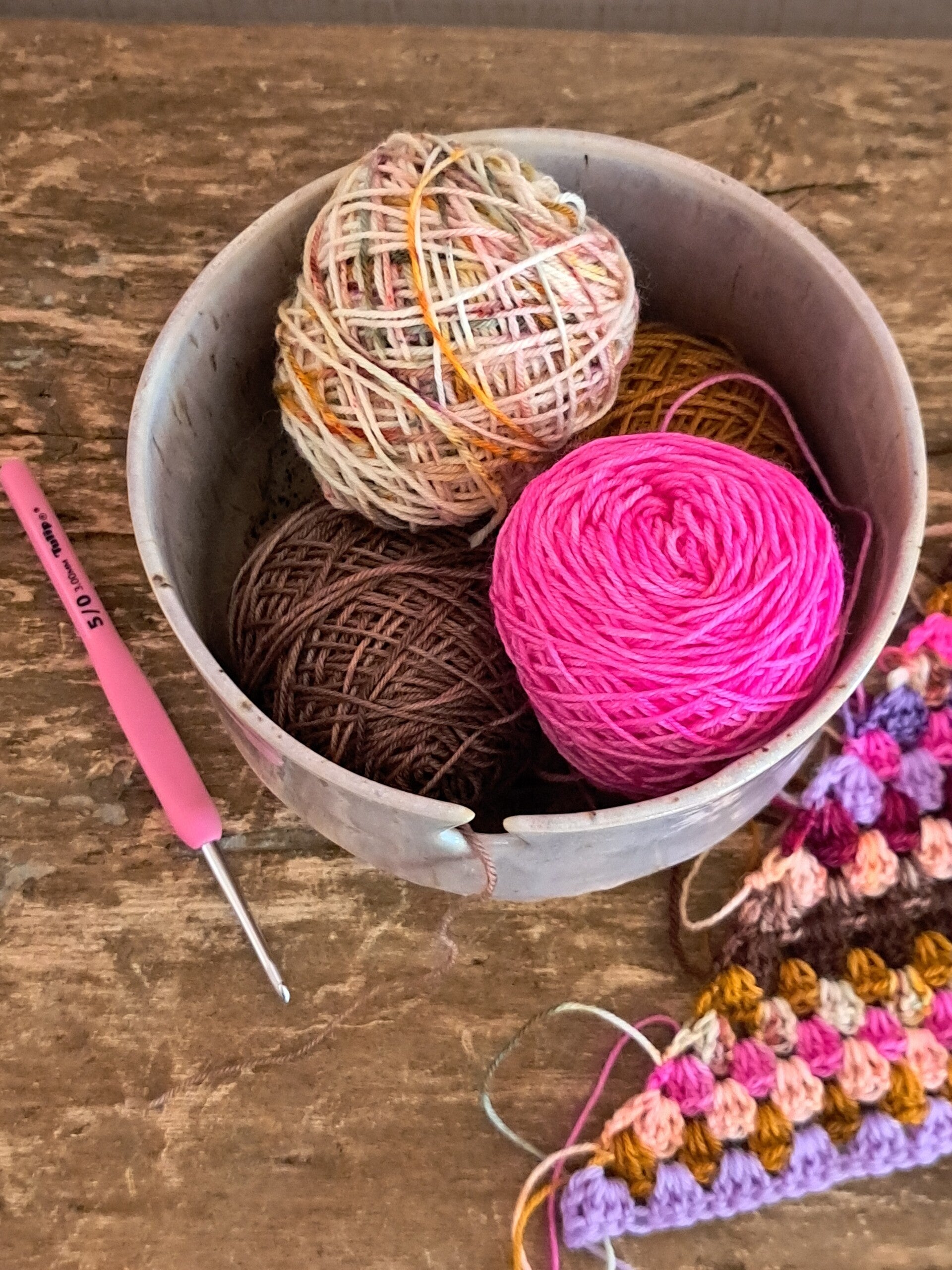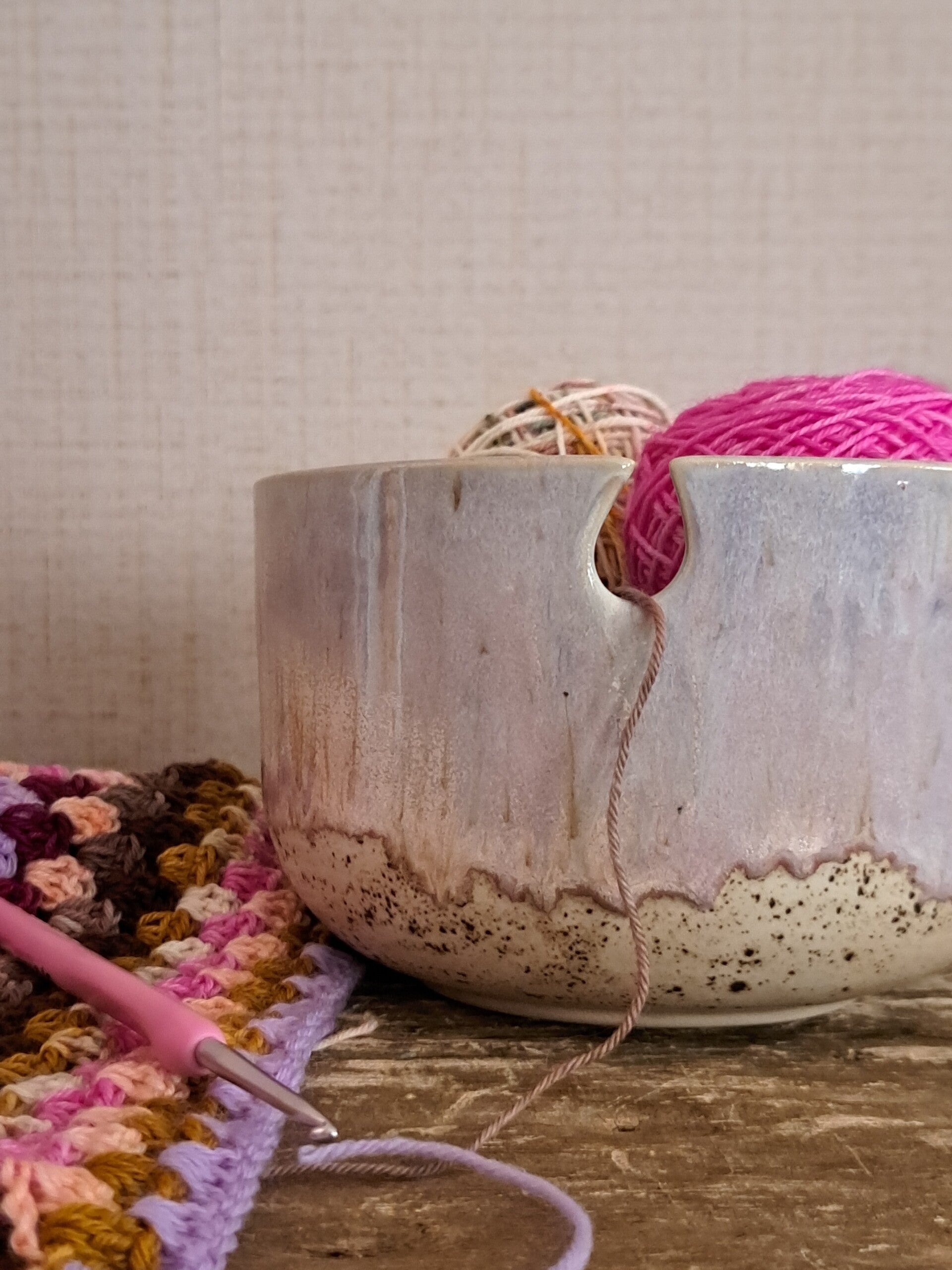Wat een kunstwerkje, deze garenkom. Handgemaakt door Piece of Clay. Geen bolletjes meer die wegrollen tijdens het haken of breien. Je legt je bol wol in de kom, haalt de draad door de opening en bent ready to go!
