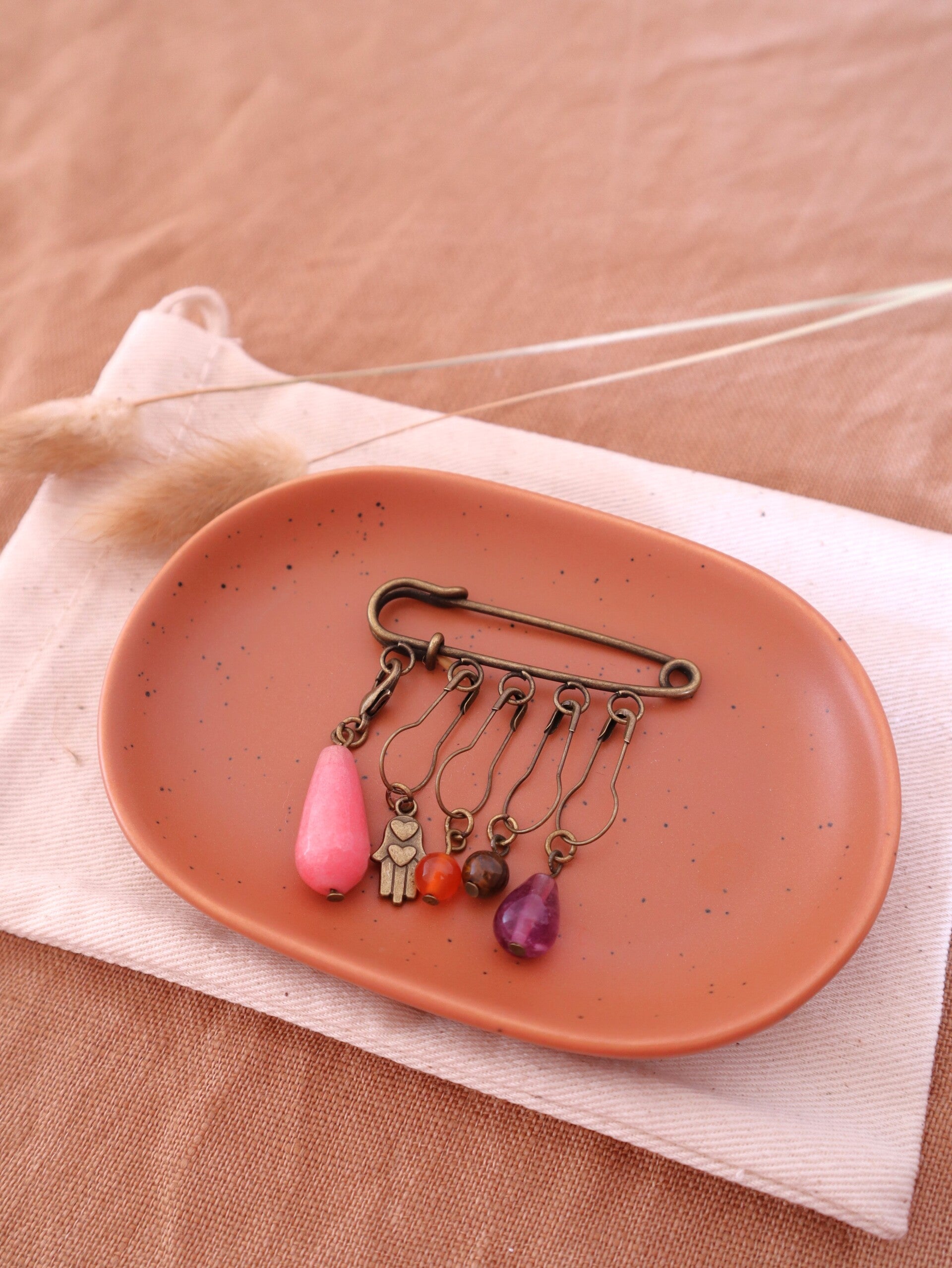 Set van 4 steekmarkeerders en een progresskeeper met edelstenen, aan een speld. Ideaal om aan je projectbag te spelden.