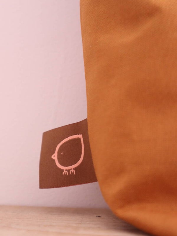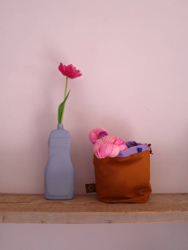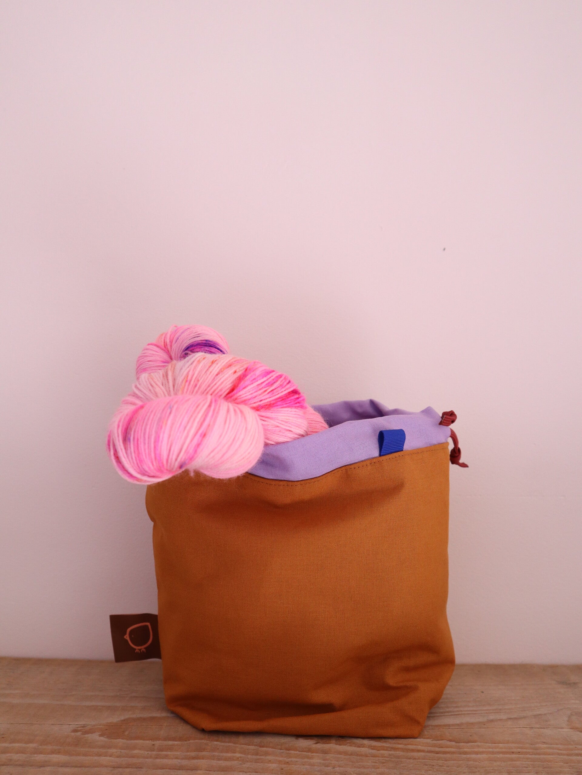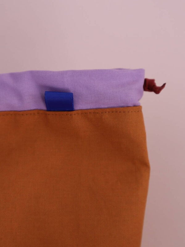 Toffe handgemaakte projectbag van caramel eco-katoen, gevoerd met lila ecokatoen en kobaltblauw binnenvak. De kobaltblauwe accenten maken het helemaal af.